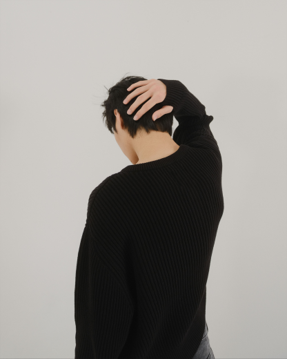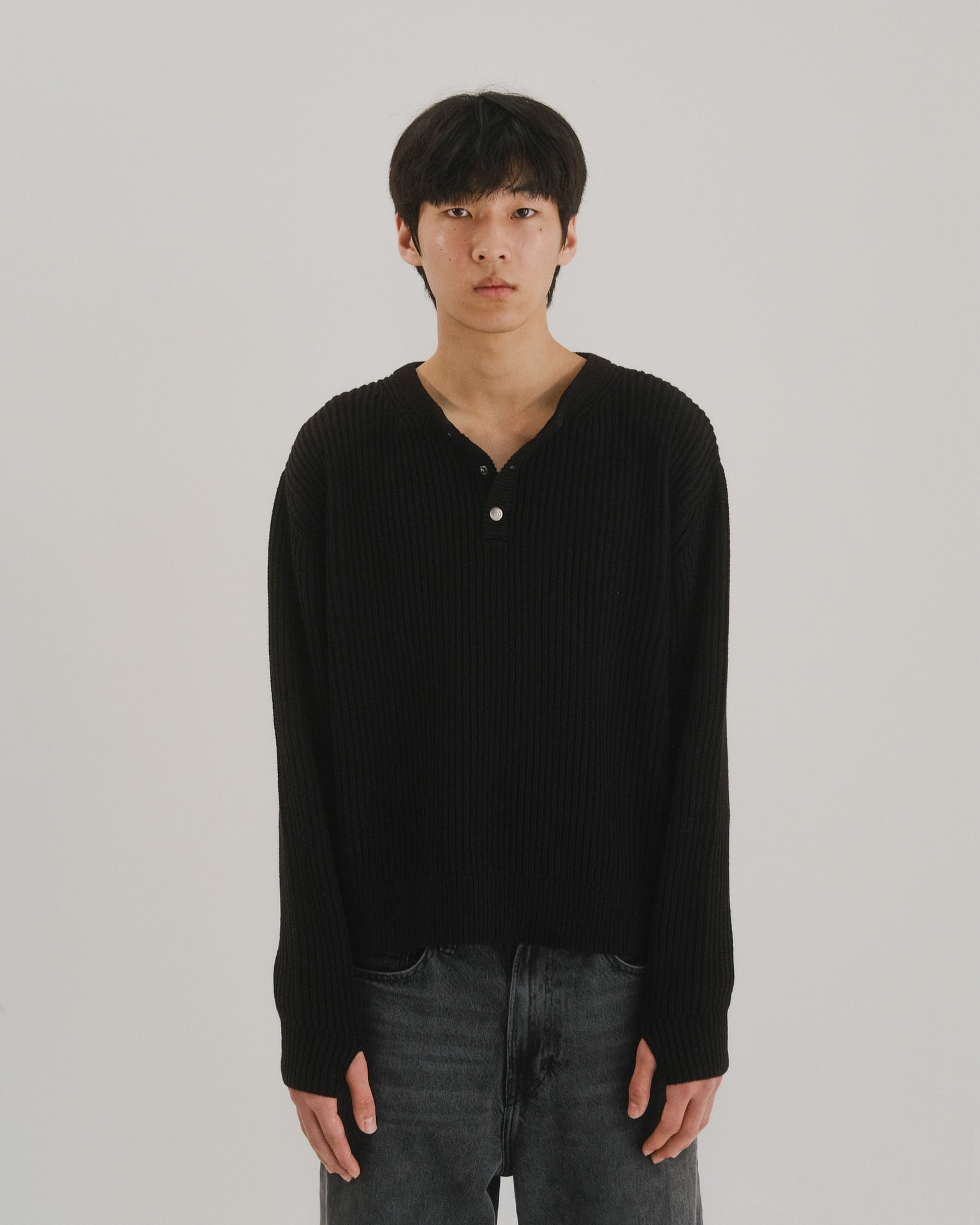 This garment is knitted from 5 gauge 100% cotton yarn, forming a richly textured and heavyweight knit. It features a 3-button Henley placket with custom gunmetal snap buttons, giving it a classic style with a slight modern edge, the placket also allows for ventilation in warmer conditions.