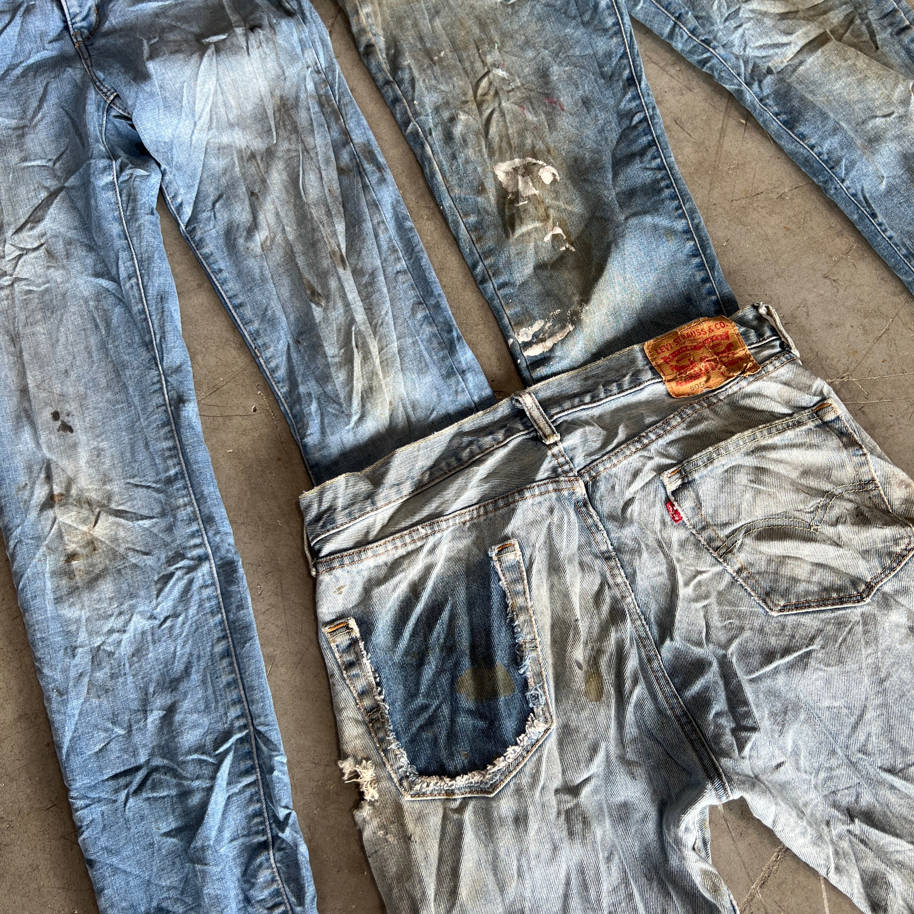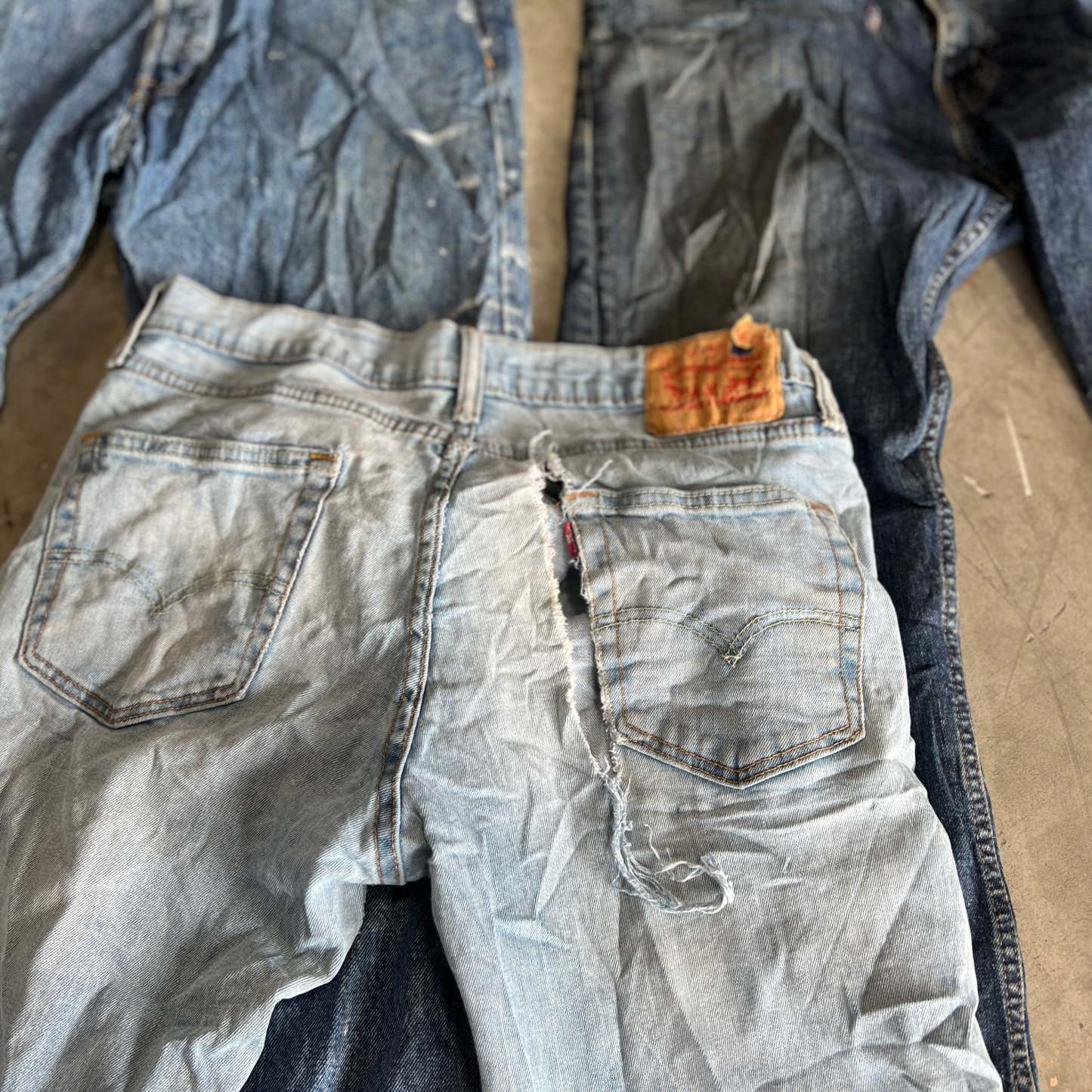 Our B-Grade Levi's jeans are great for reworking or a distressed look in bulk. Expect a variety of washes in blue denim with the occasional black or color pair. Our Levis come in a mix of 100% cotton and mixed with lycra or elastane. We do not offer vintage Levis jeans only; we also include modern ones. Styles range from 90s-modern. You may also receive a small amount of Wrangler jeans.