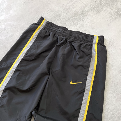 I pantaloni Nike degli anni 2000 rappresentano un'icona di stile sportivo e funzionalità, perfettamente in linea con l'estetica di quel decennio. Realizzati prevalentemente in tessuti tecnici come il nylon o il poliestere, si distinguono per il loro taglio ampio e rilassato, con elastici in vita e alle caviglie che ne accentuano la praticità. Spesso arricchiti da tasche laterali con zip e dettagli riflettenti, questi pantaloni incarnano lo spirito dello streetwear e dell'athleisure di quegli anni. I colori spaziano dal classico nero a tonalità più vivaci, con il logo Nike, ricamato o stampato sulla gamba, che aggiunge un tocco distintivo e riconoscibile.