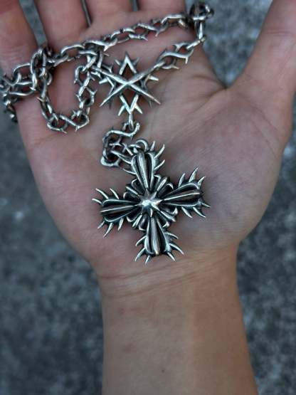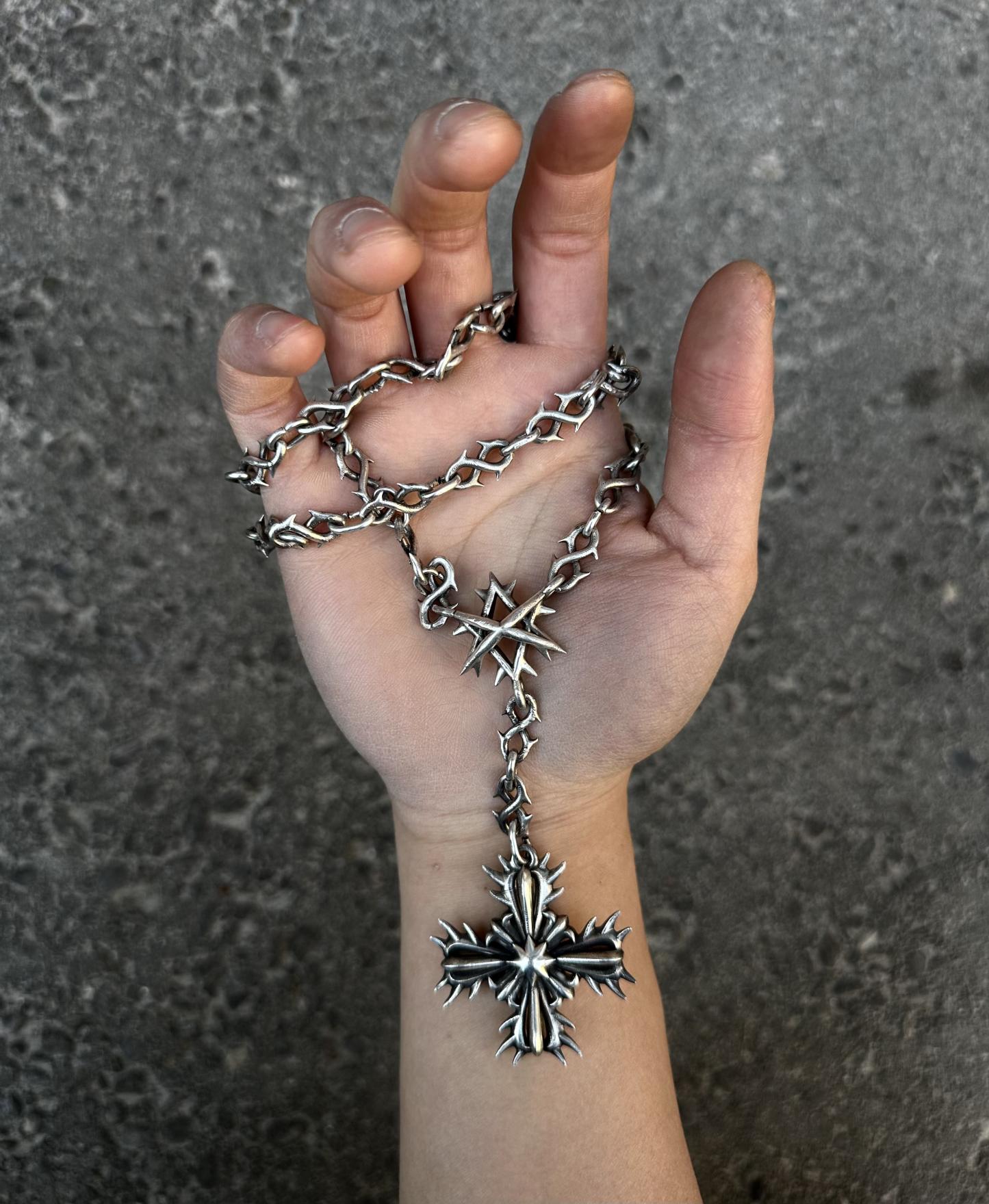 Project Comte cool af necklace comes in 2 versions Stainless steel and Sterling silver (different % of silver might be used in the alloy for different parts of the item). Chain spikes do not irritate the skin.