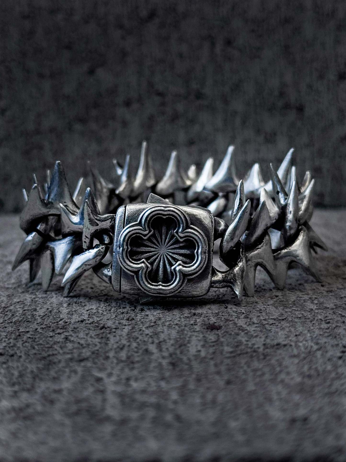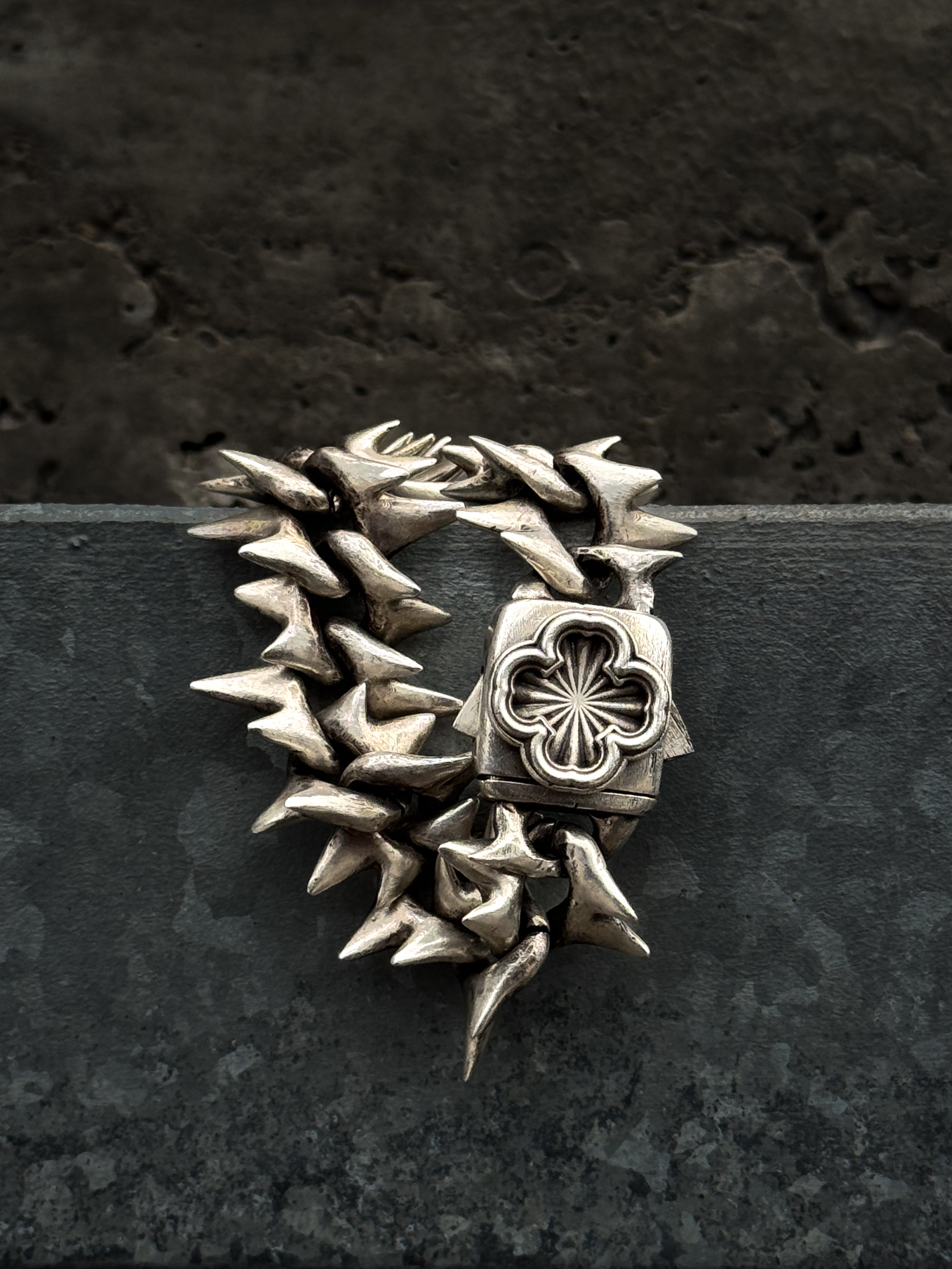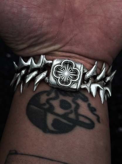 Project Comte cool af bracelet. The second version of the original dragon spine. Updated two sides clasp. comes in 2 versions Stainless steel and Sterling silver (different % of silver might be used in the alloy for different parts of the item). Spikes do not touch the skin directly.