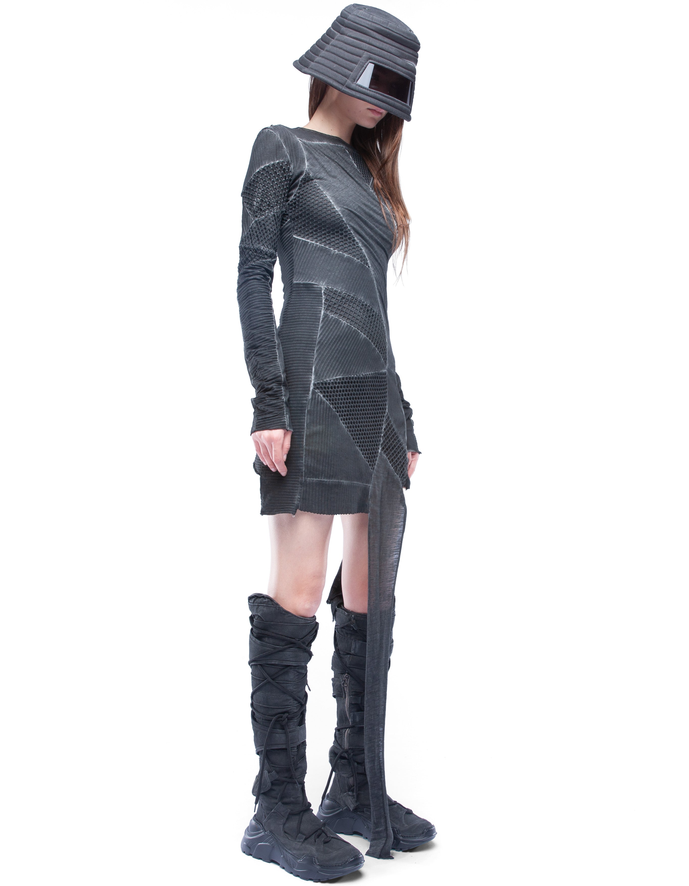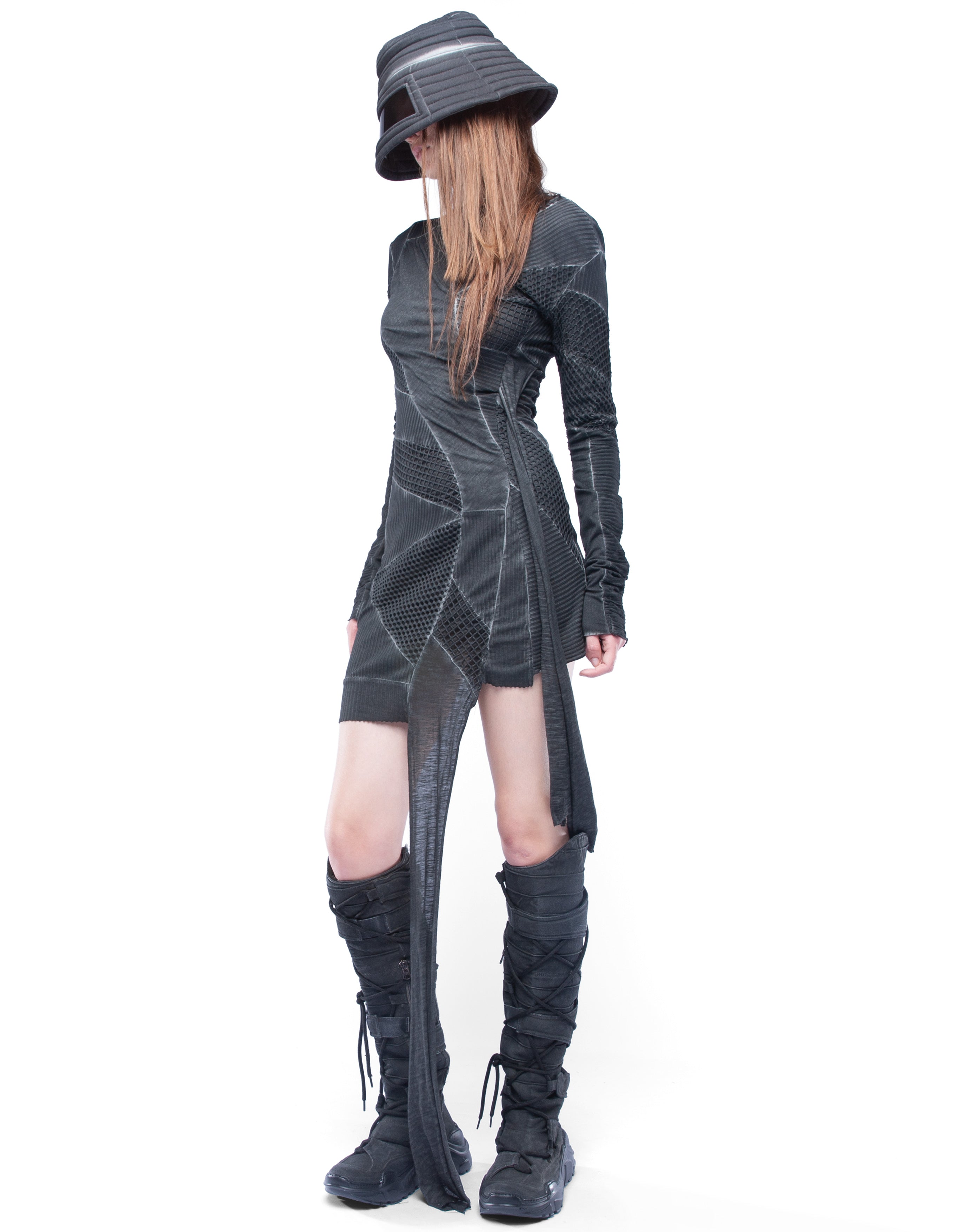 detailed woman asymmetric dresslong sleeves, open necknet transparent elements, multiple cotton layers, black washed effect