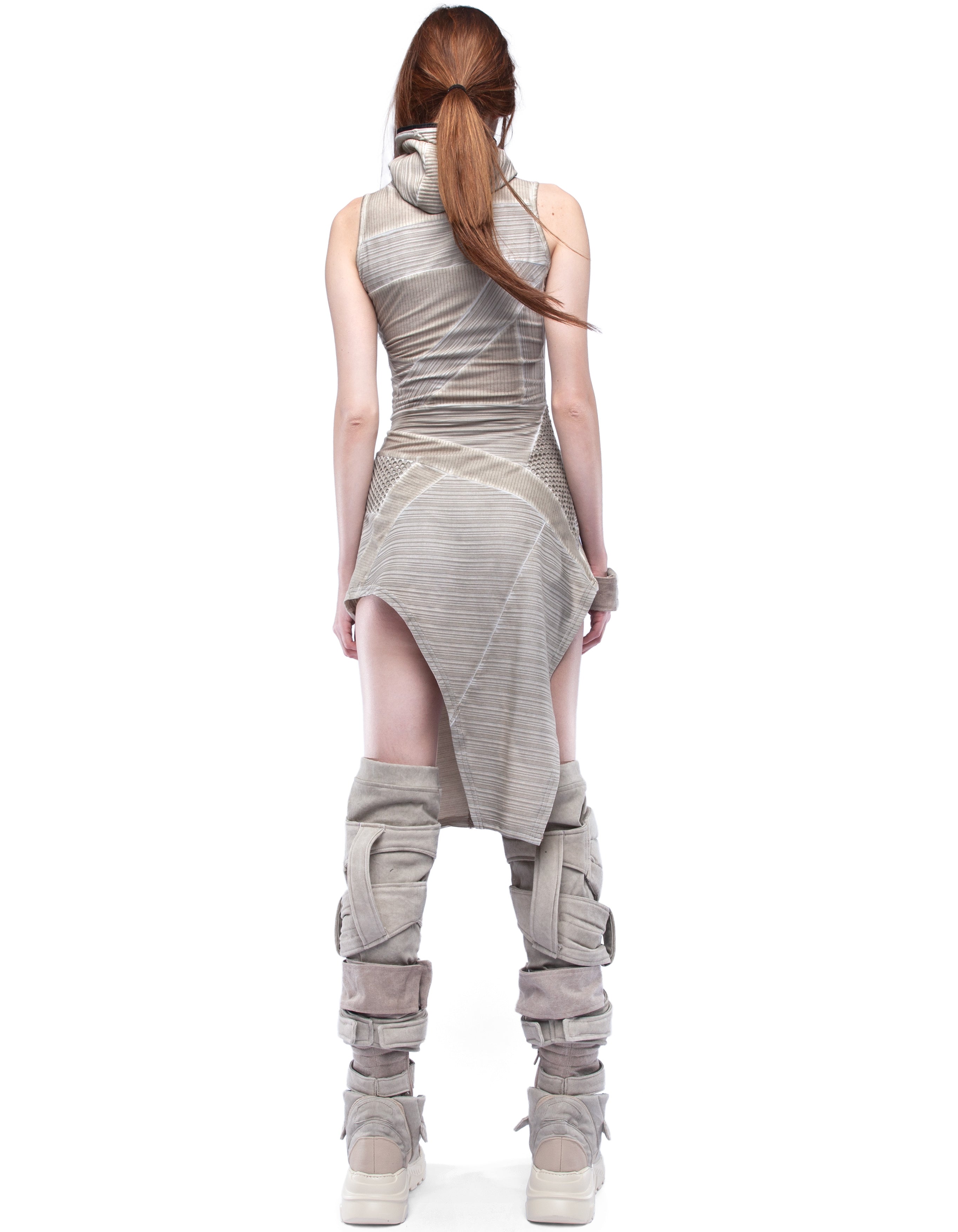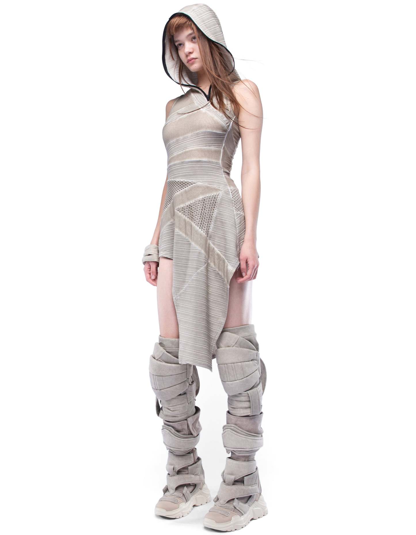detailed woman asymmetric sleeveless dress with zipped hoodnet transparent elements, multiple cotton layers, dusty beige washed effect