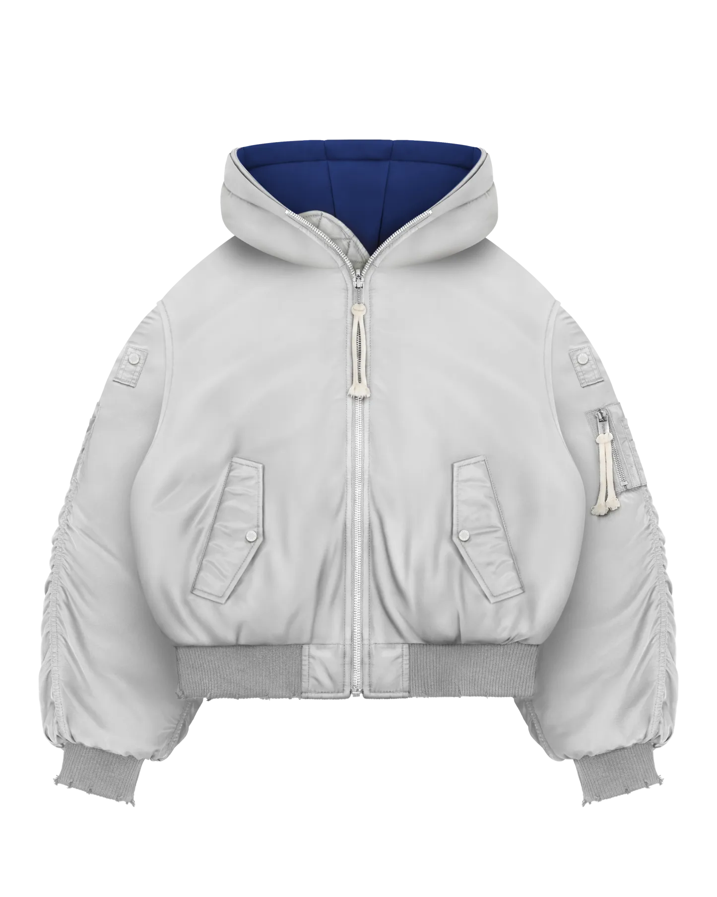 Gunmetal reversible front and arm pocket zip pullers.