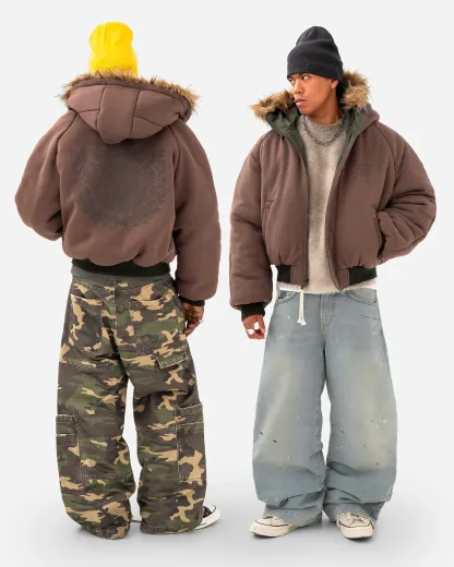 Completely reversible heavyweight padded winter jacket.