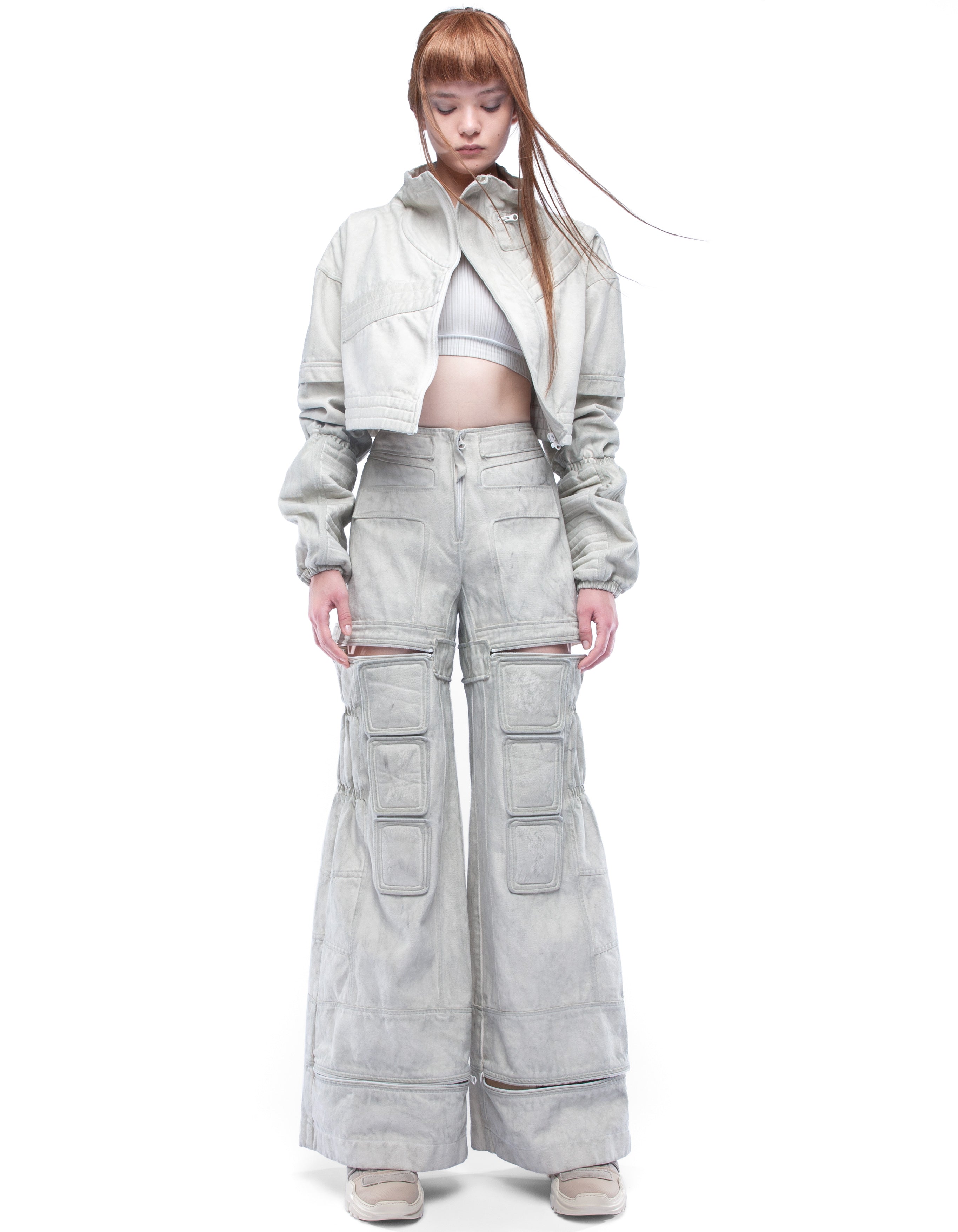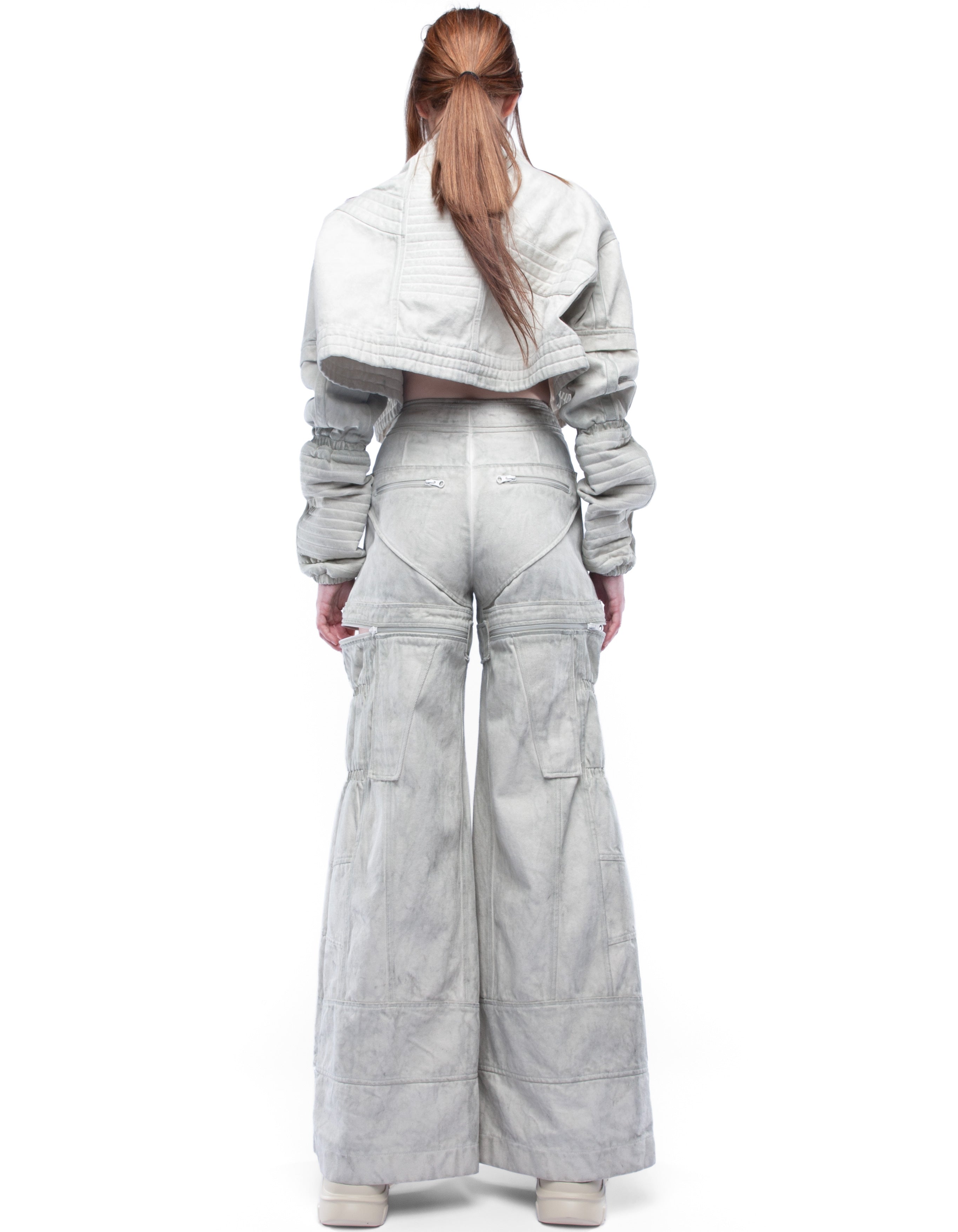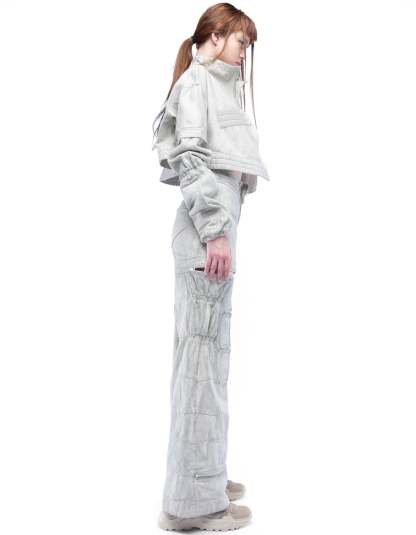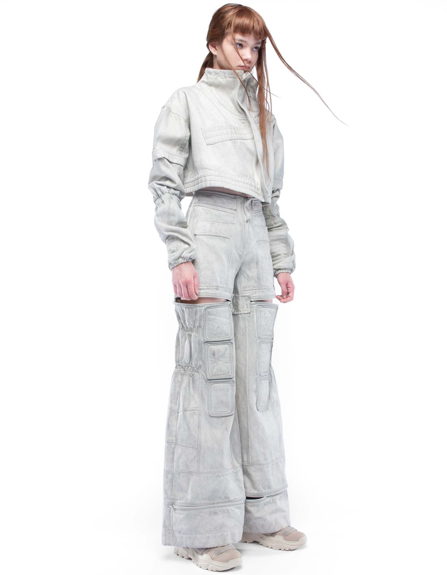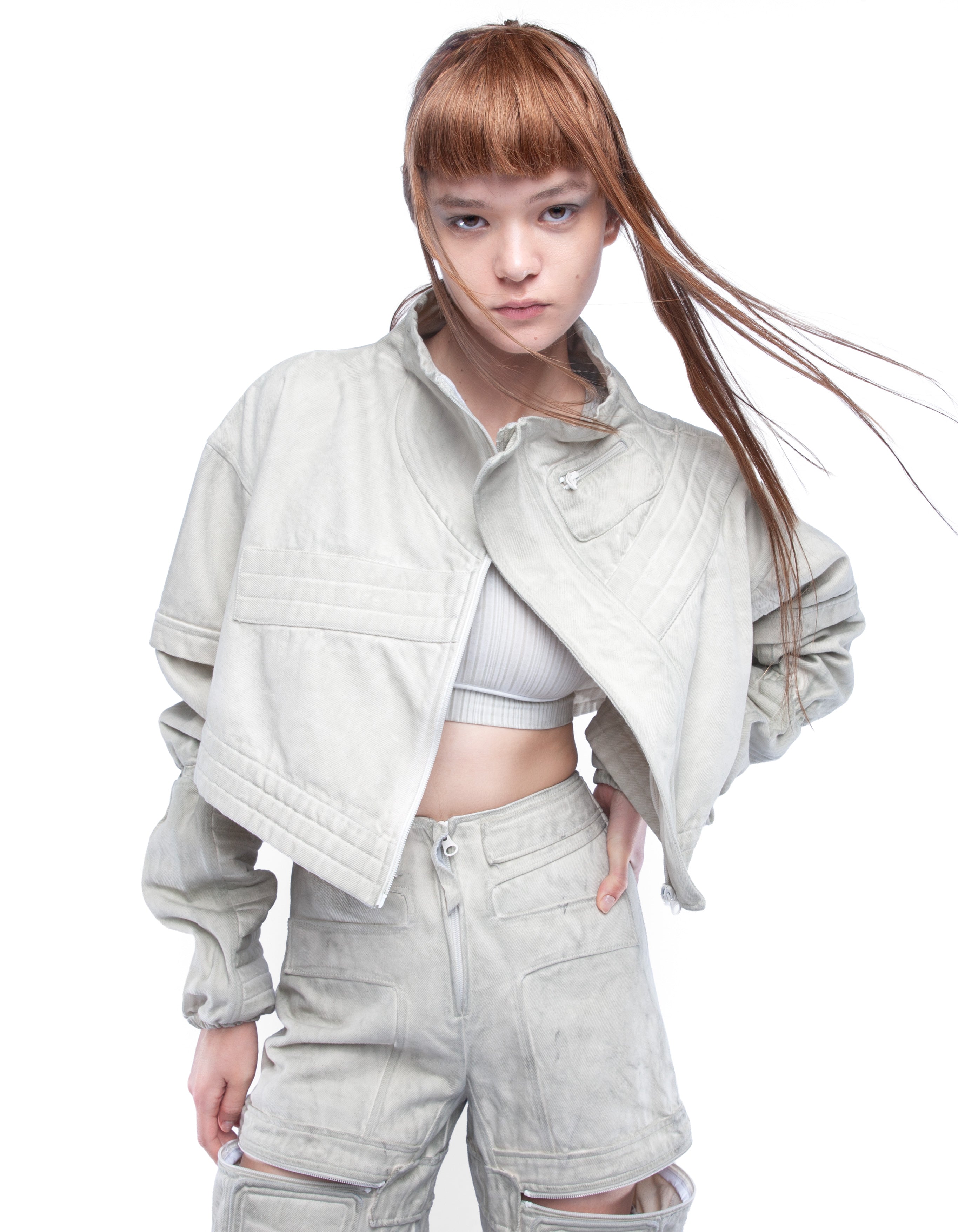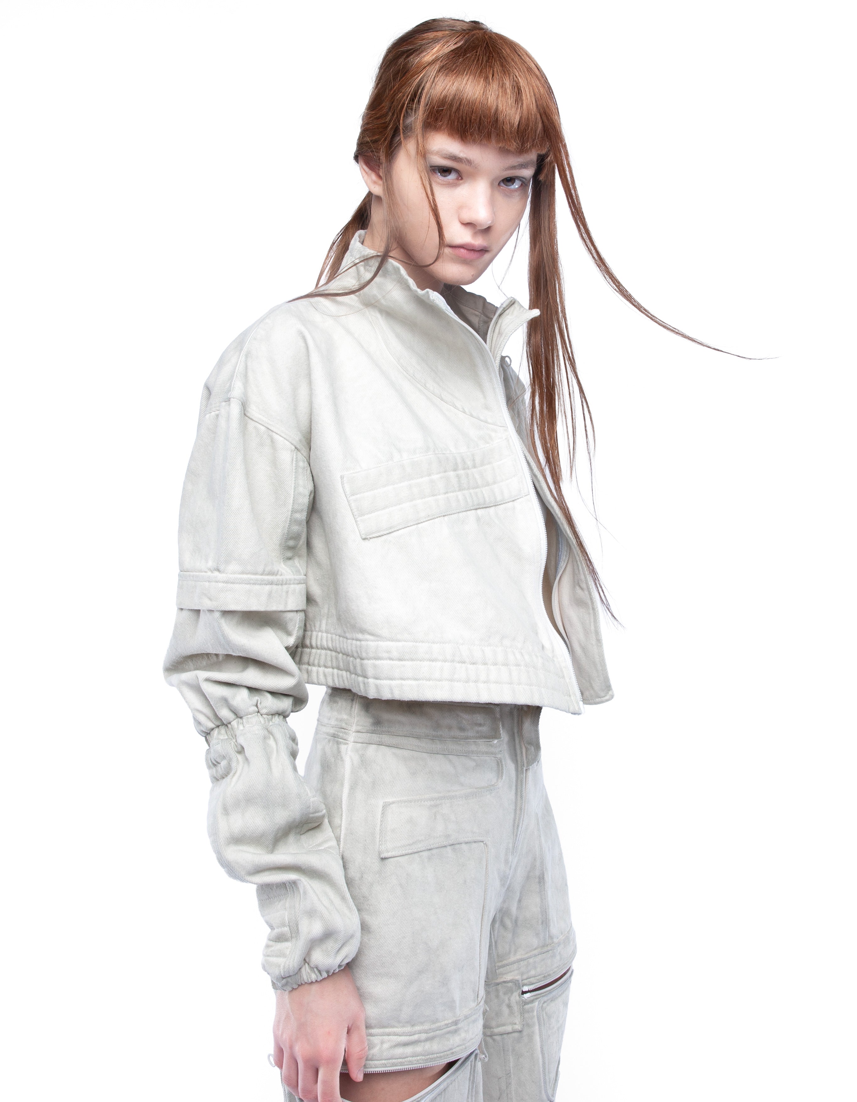 short heavy-cotton jacket in dusty cool light beige, with a high structured collar, elasticated long, sleeves and front zipper closure, dusty-washed finishing