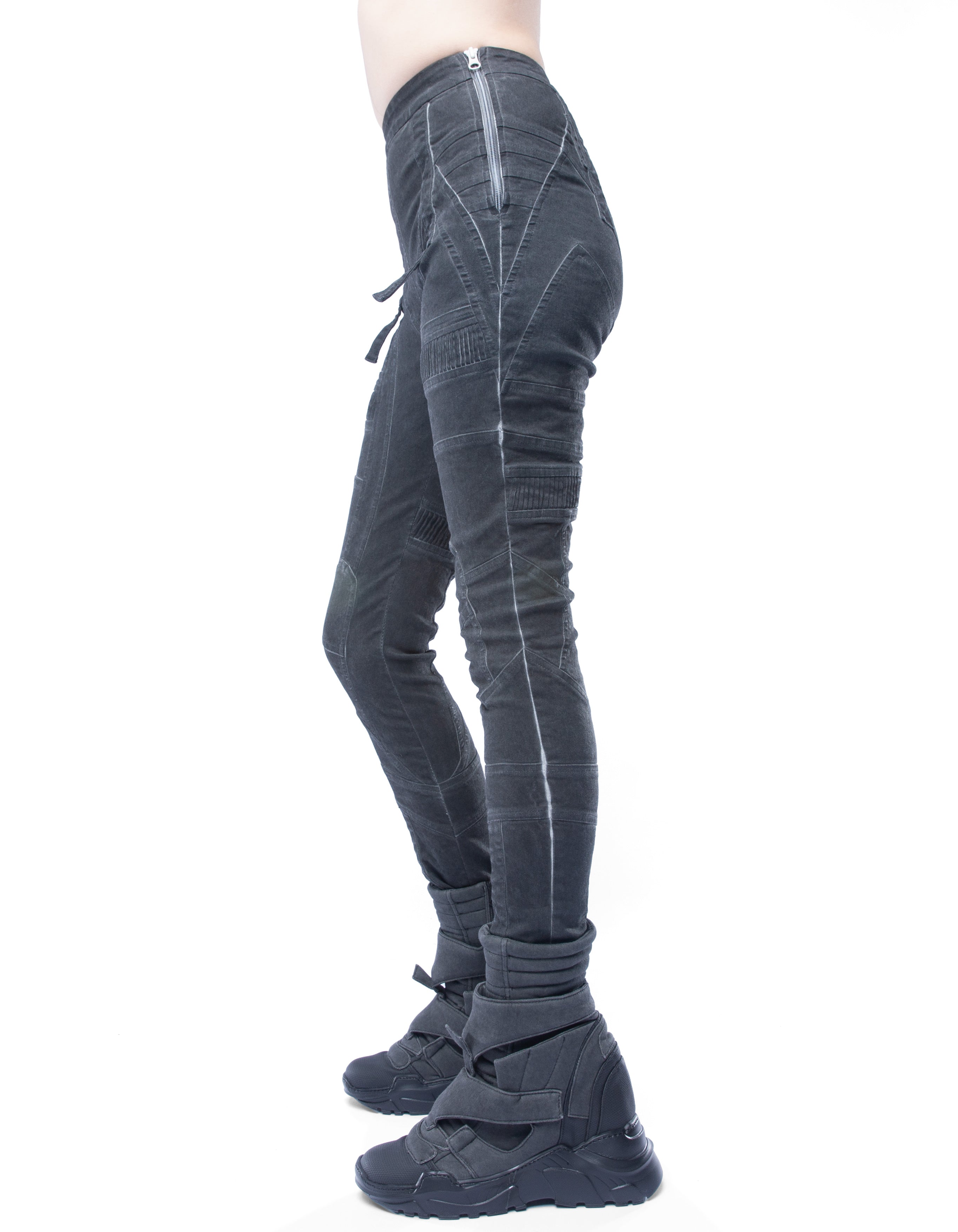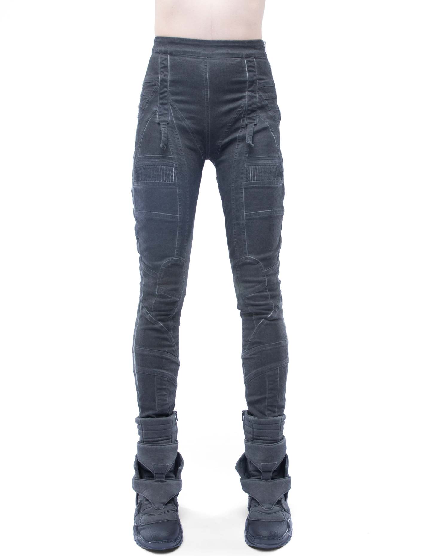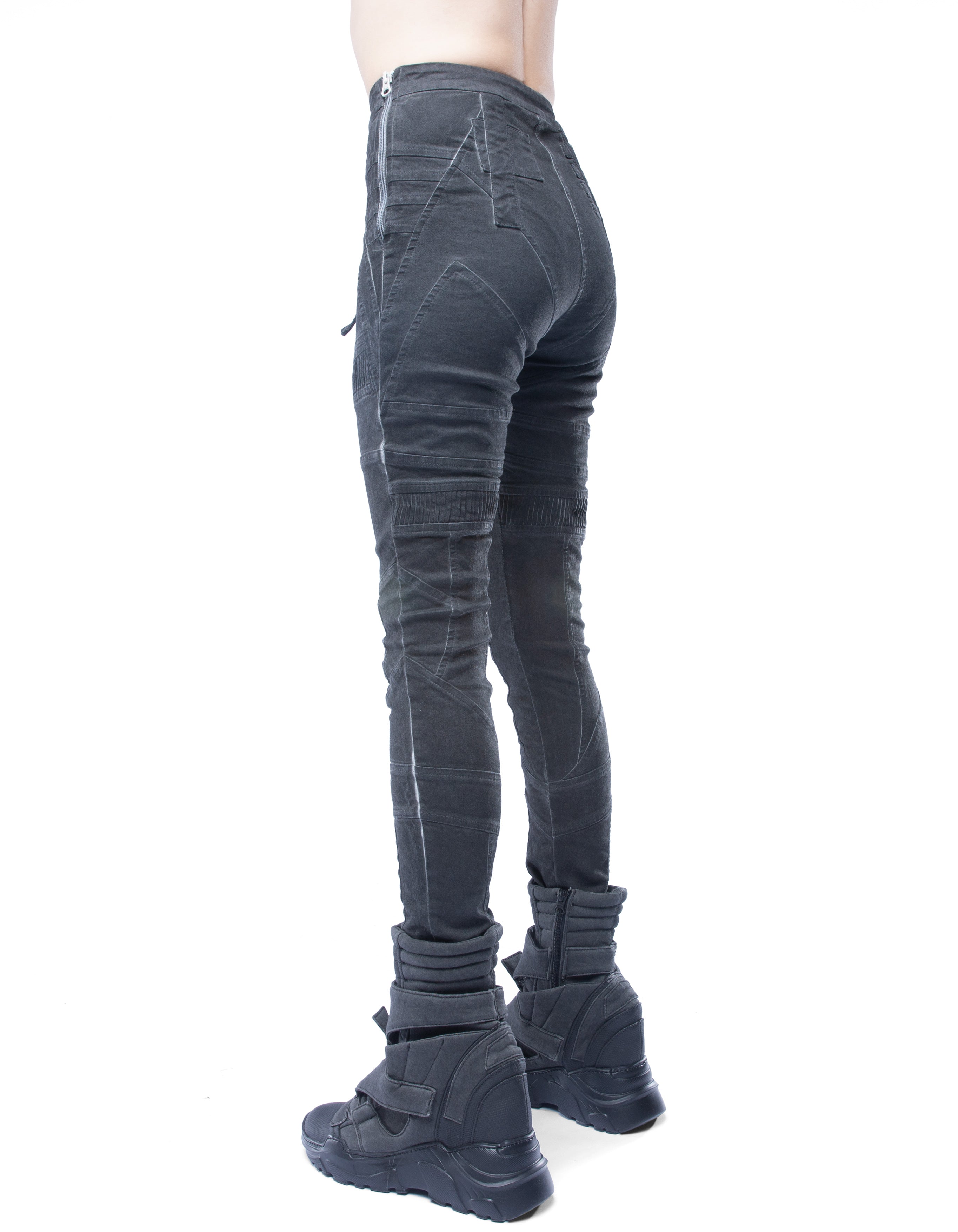 futuristic detailed elastic-denim high-waist leggings with sculpted panel construction and small front flap details in vintage washed black effect