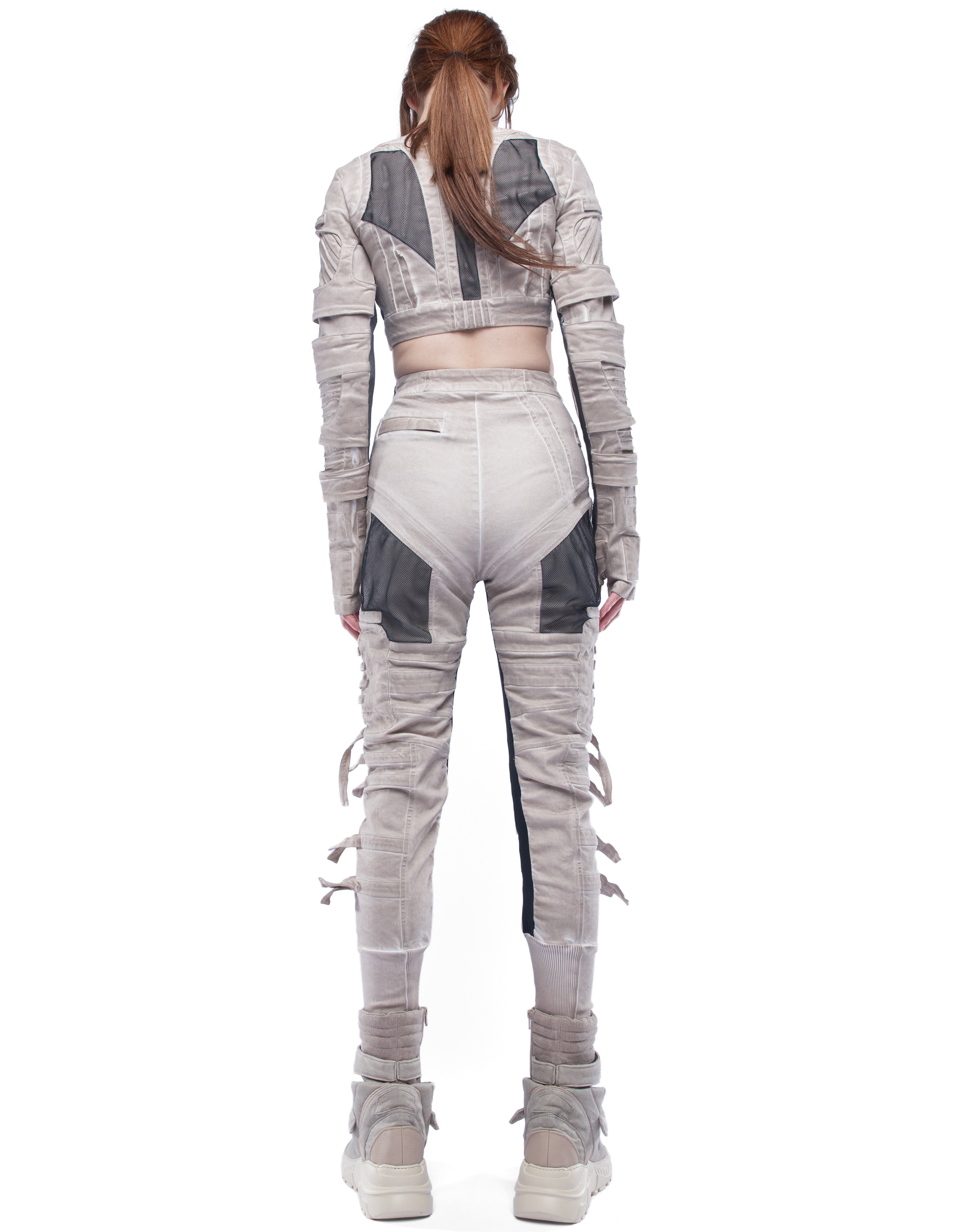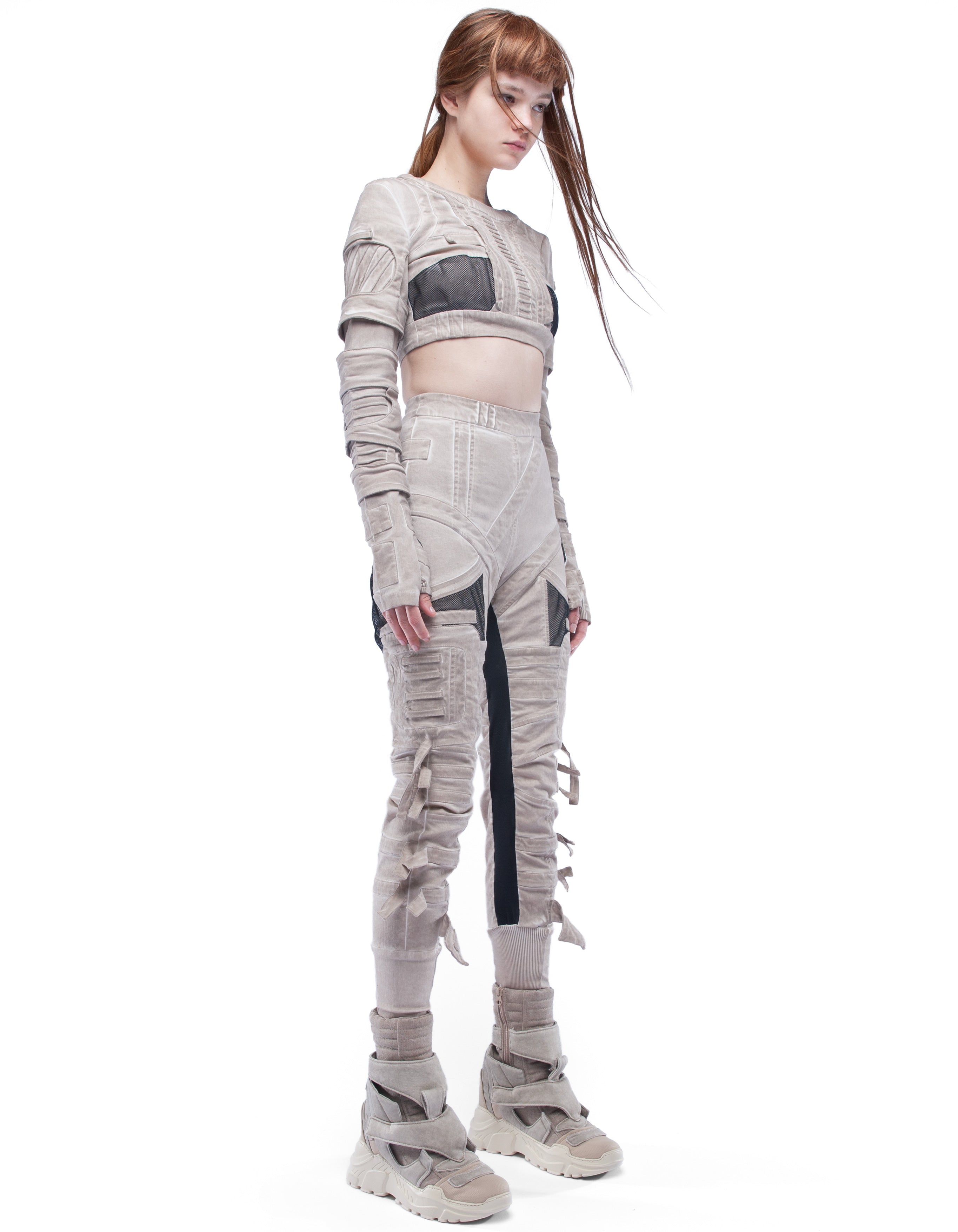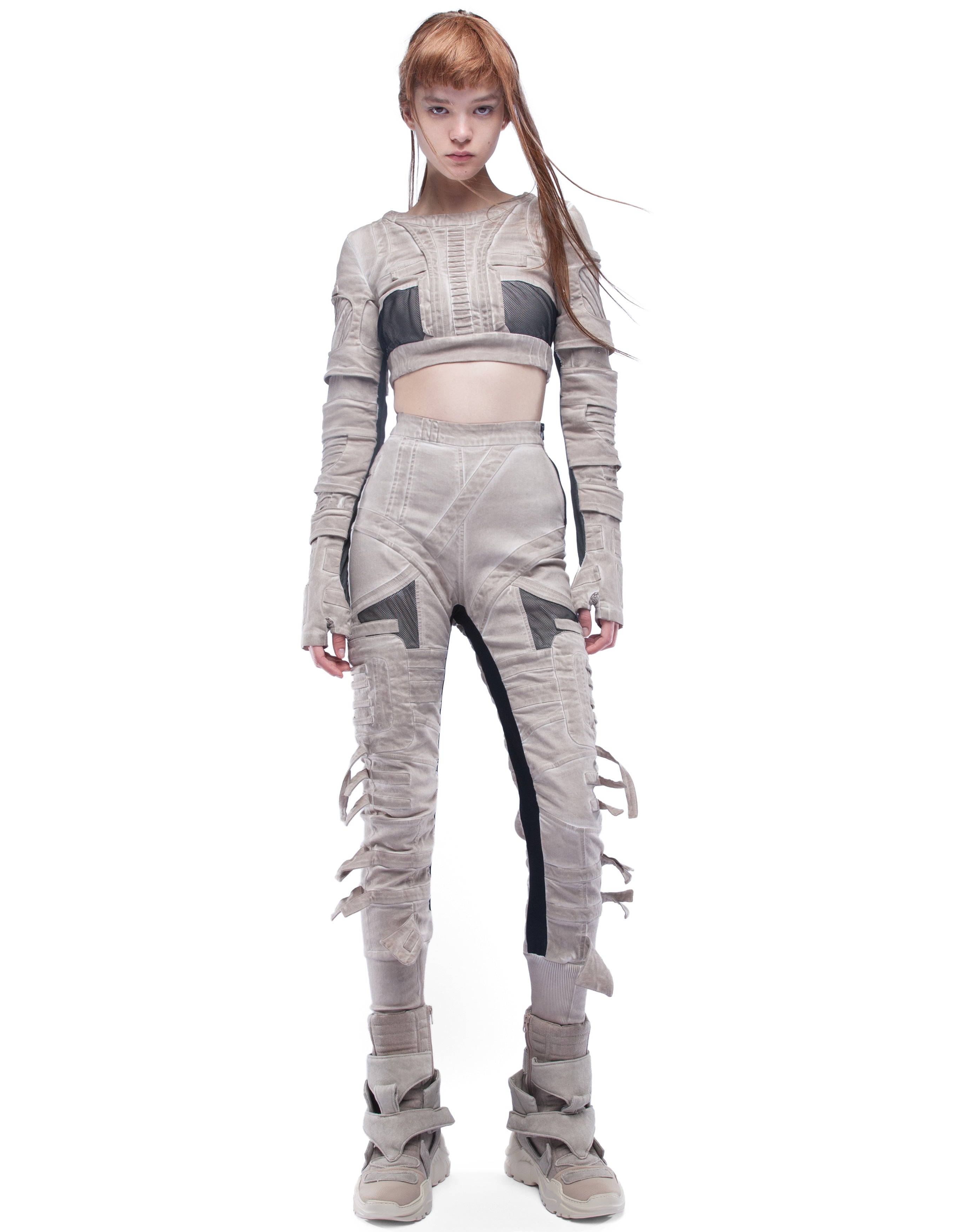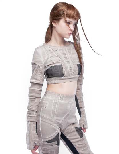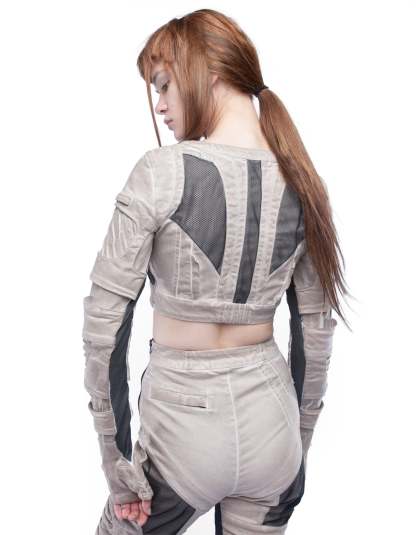 futuristic detailed elastic-denim short top with mesh elements and long layered finger sleeves open neck and dusty washed light beige effect side zipper closing