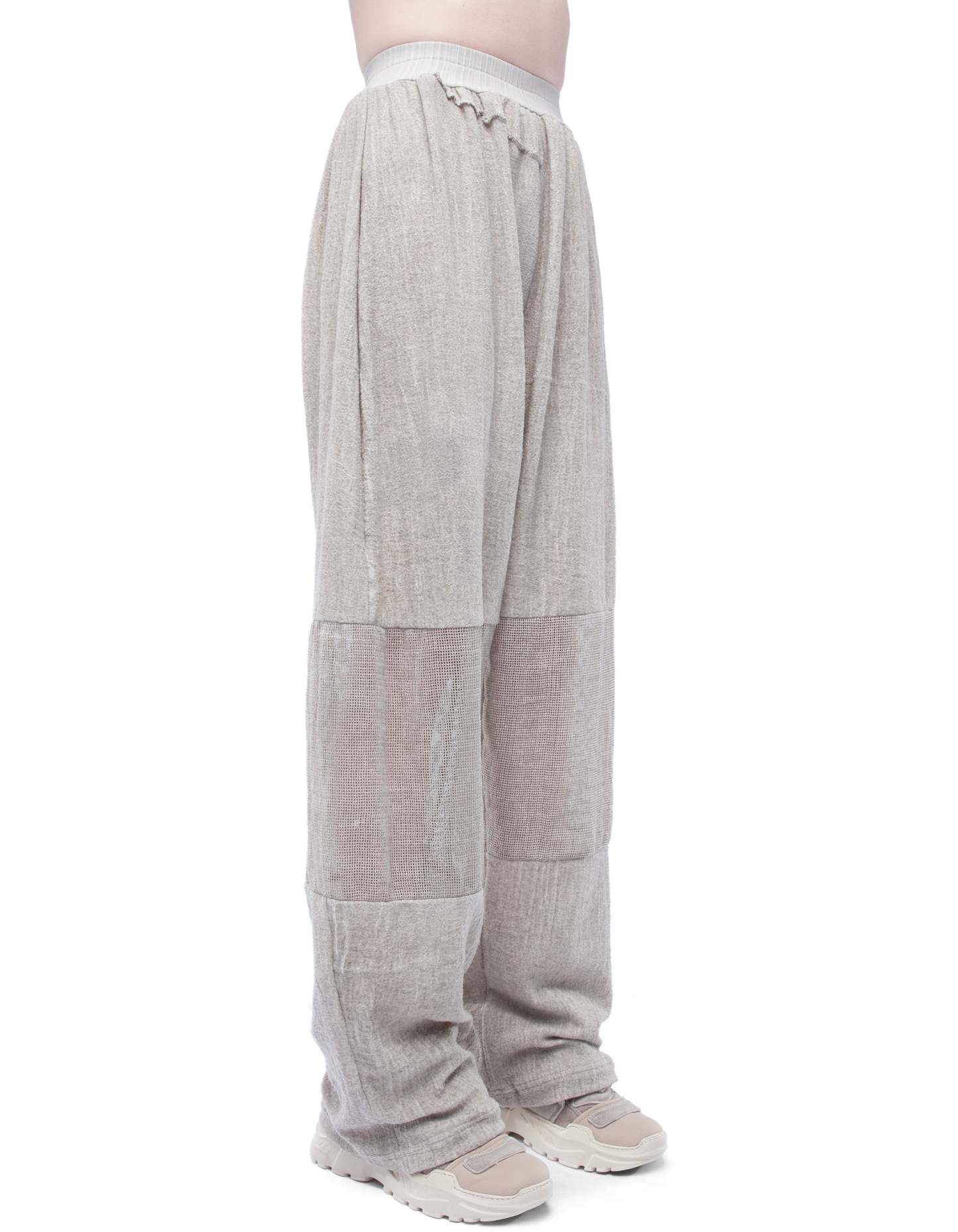 woman wide cozy crinkled-linen trousers, elastic belt, no pocketsnet transparent knee panelsdusty beige washed effect