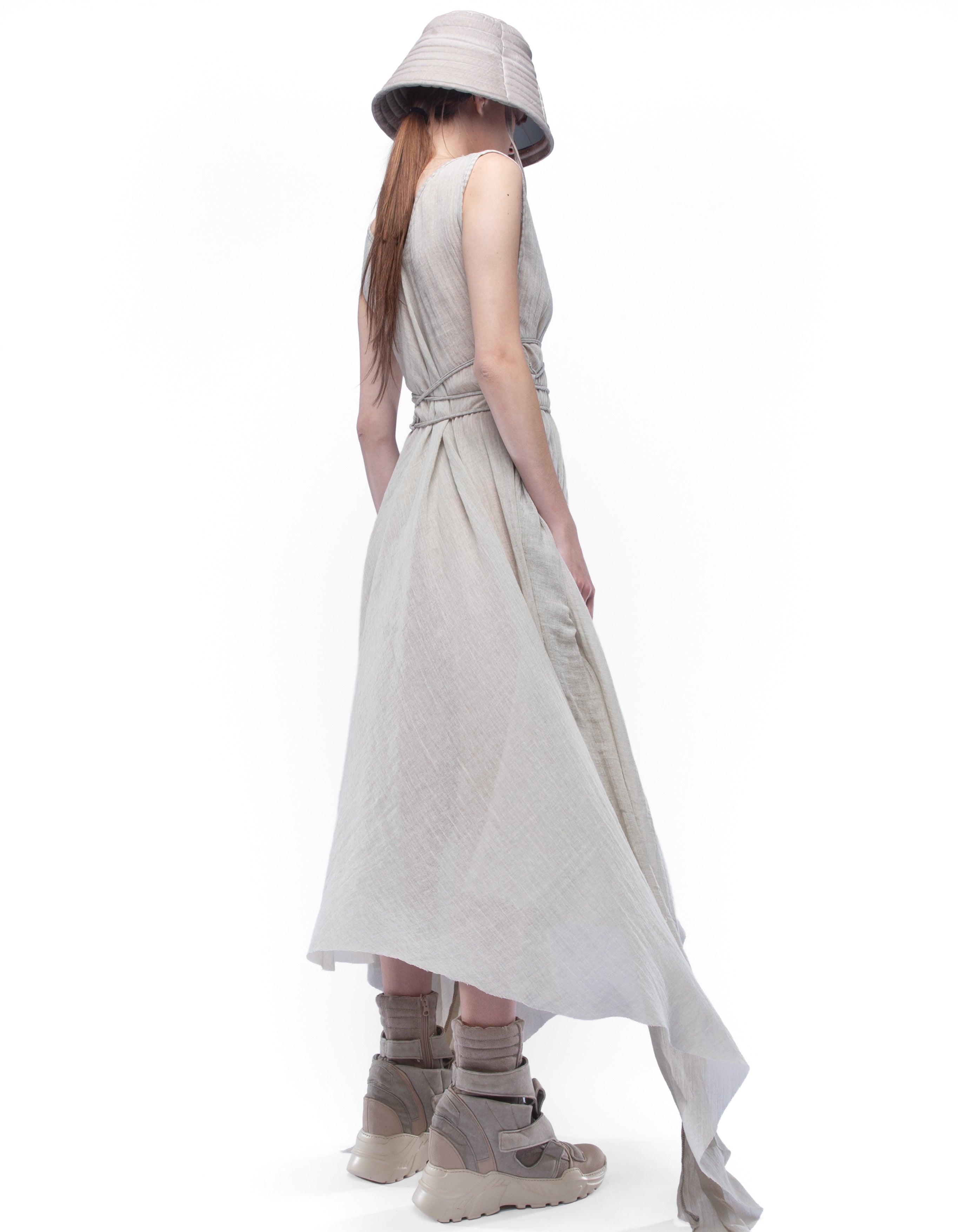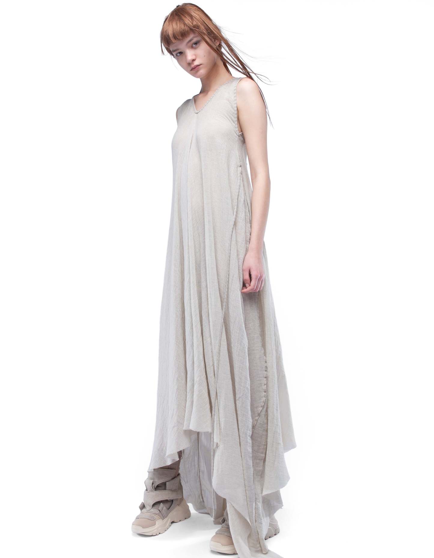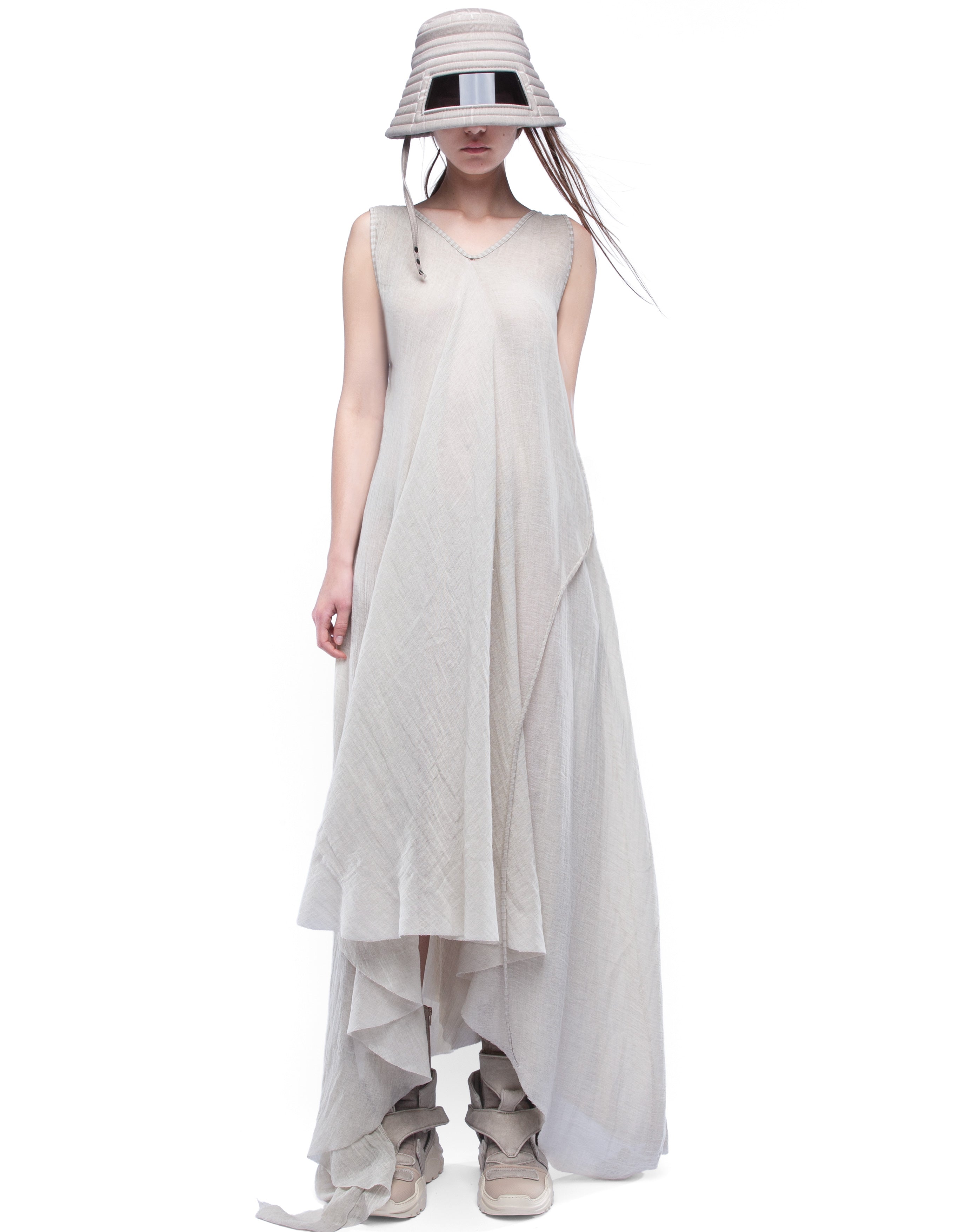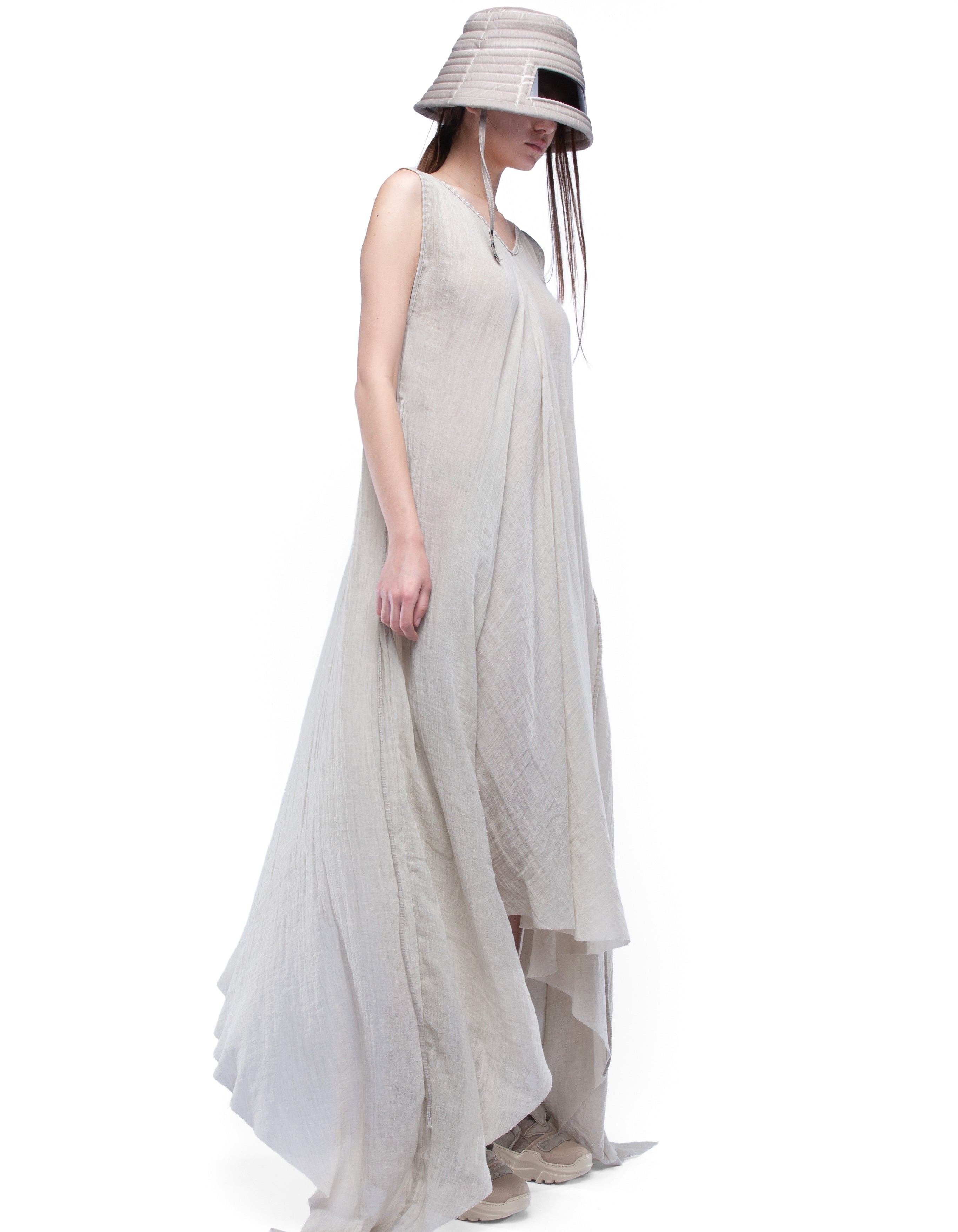 long sleeveless V-neck cozy dress made from light semi-transparent cotton with asymmetric draped silhouette and dusty beige washed effect