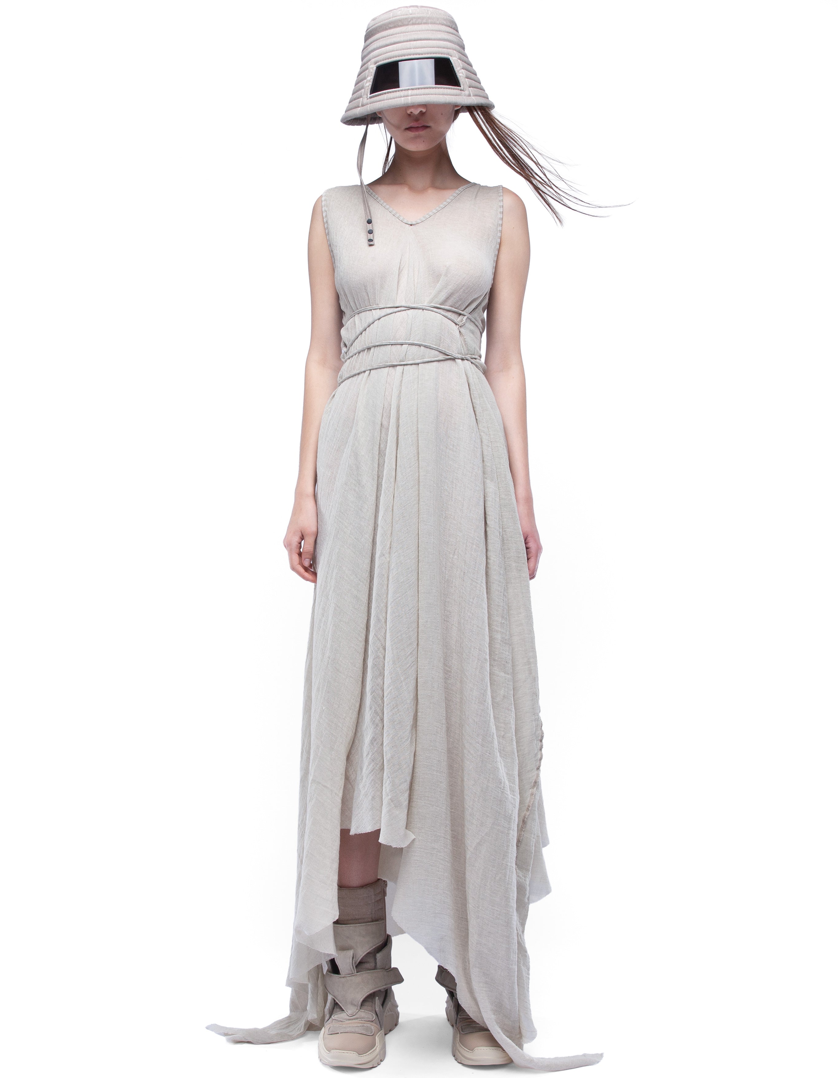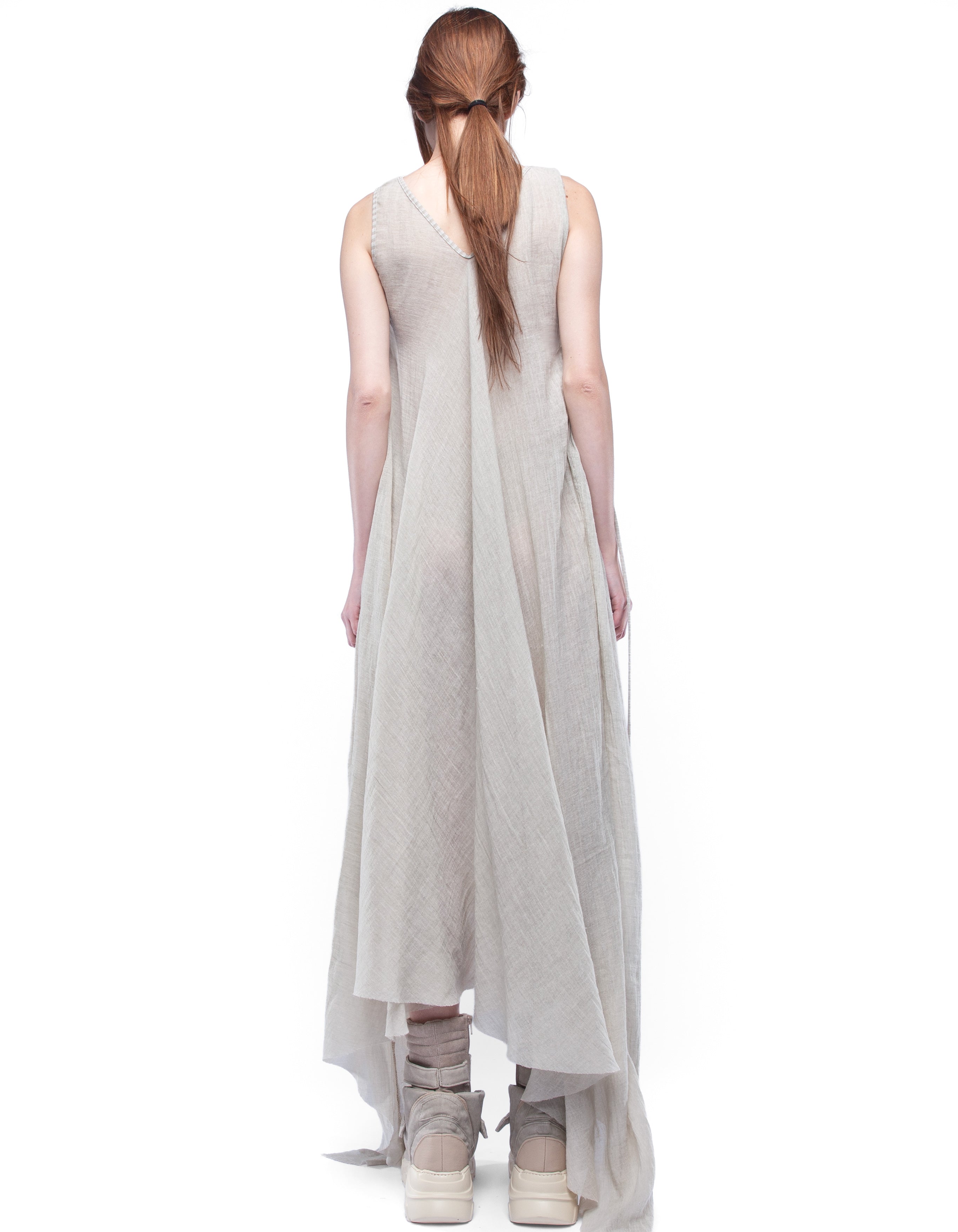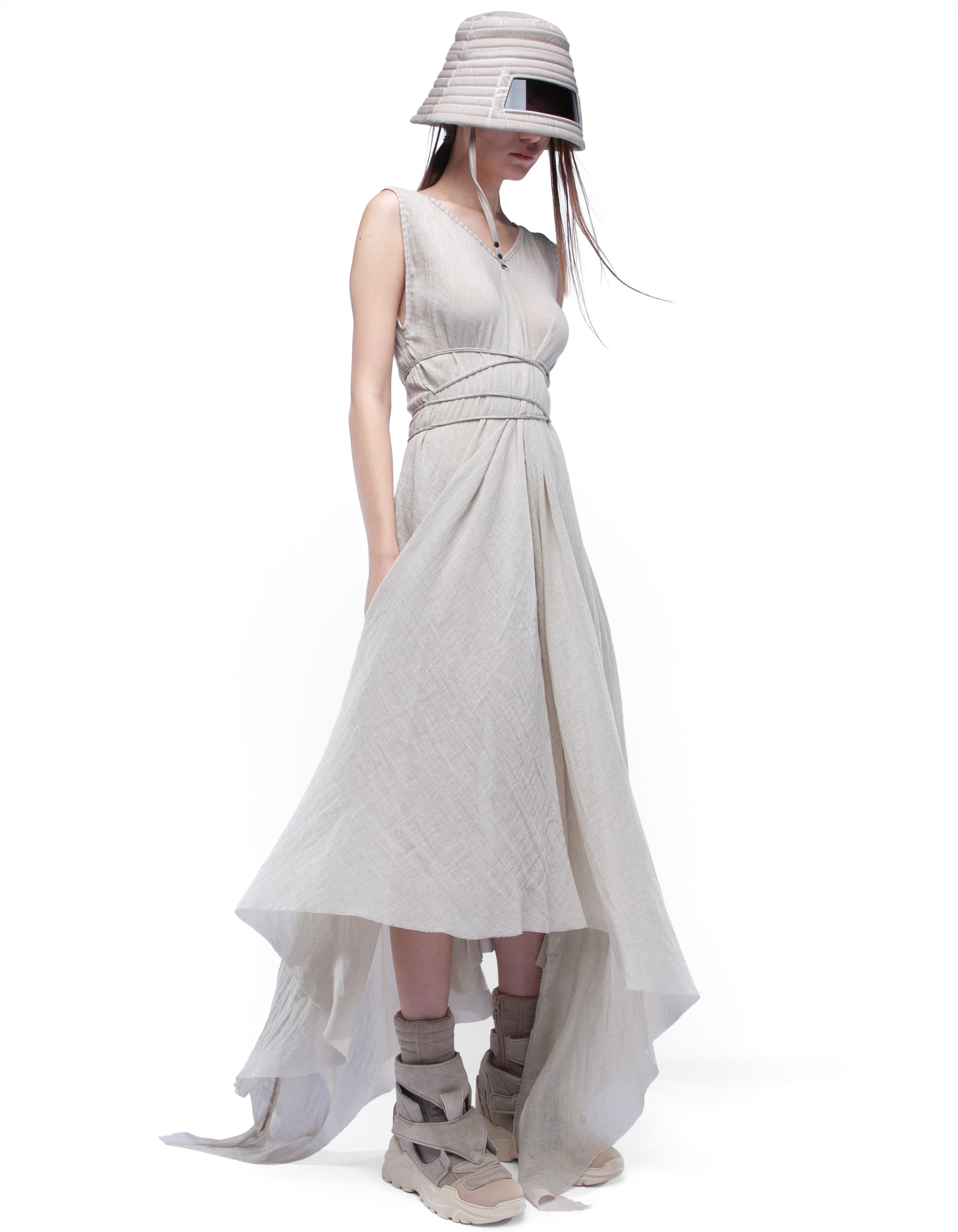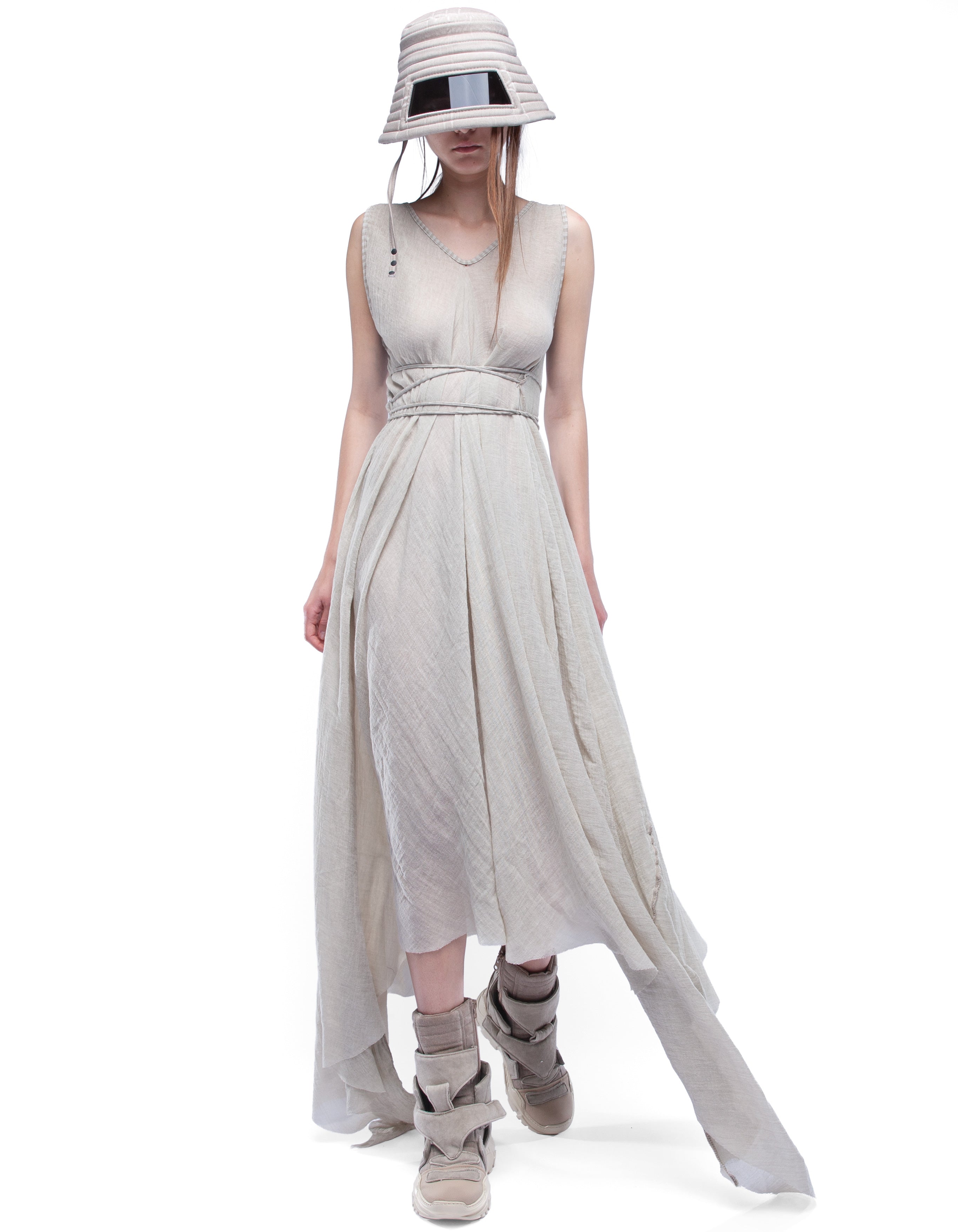 long sleeveless V-neck cozy dress made from light semi-transparent cotton with asymmetric draped silhouette and dusty beige washed effect