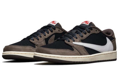 Nike Air Jordan 1 Low OG “Travis Scott” Arriving in La Flame’s signature brown and black colour scheme, the Travis Scott x Nike Air Jordan 1 Low is crafted from a range of ultra premium materials including luxe leather and smooth suede. Dressed in a Black, Dark Mocha, University Red, and Sail color scheme. The shoe features a Black-based upper with Dark Brown overlays, Red accents on the branding atop a Sail rubber sole.
