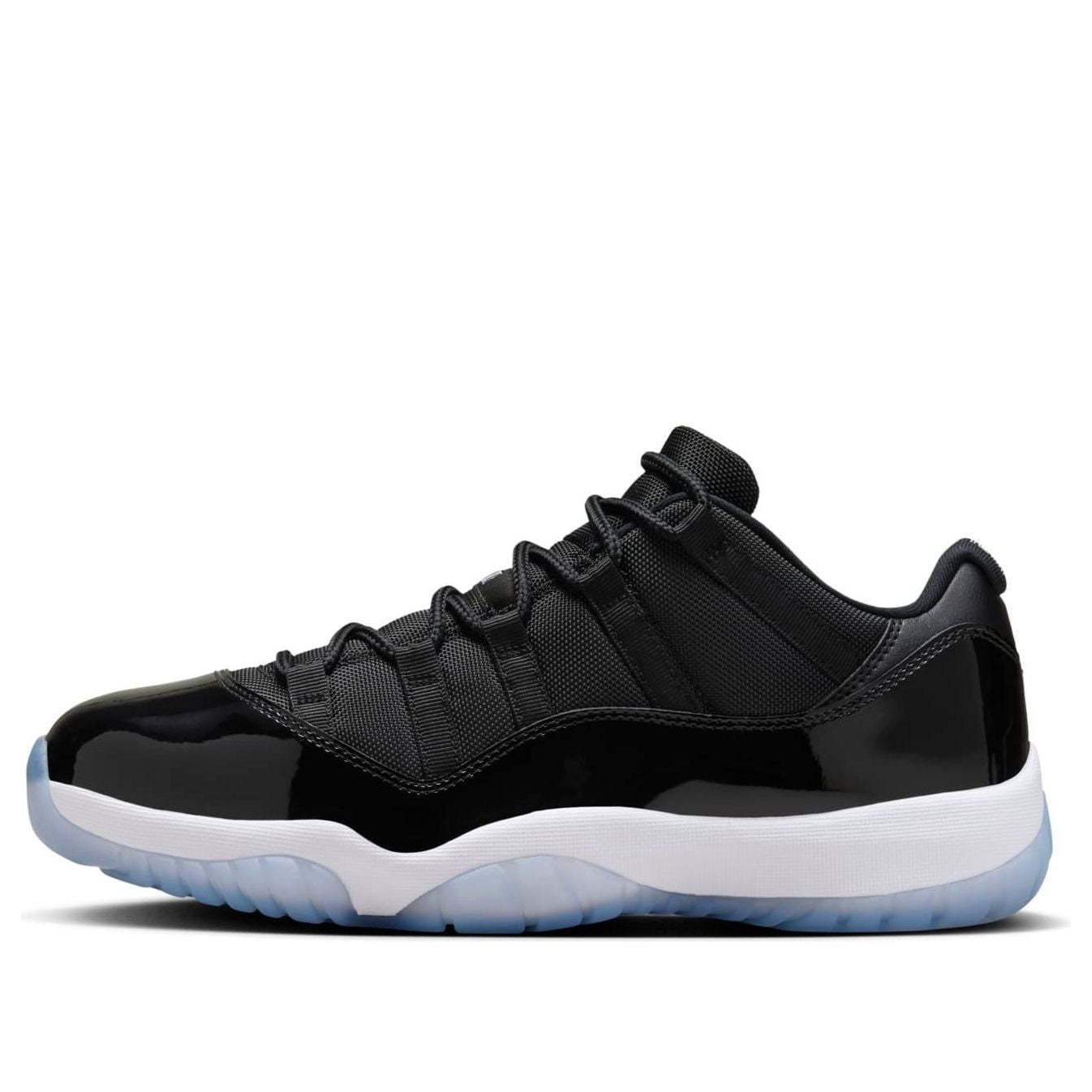 The Air Jordan 11 Low 'Space Jam' draws inspiration from the iconic high-top AJ11 of the same name. This sneaker features a black ballistic mesh upper complemented by a tonal patent leather mudguard. Rope laces thread through webbing eyelets, ensuring a secure fit. The back heel showcases a stylized ‘23’ and classic Jumpman branding. Anchoring the shoe is a white Phylon midsole equipped with full-length Air-sole cushioning and an exposed carbon fiber plate. The translucent rubber outsole boasts herringbone traction pods for superior grip.