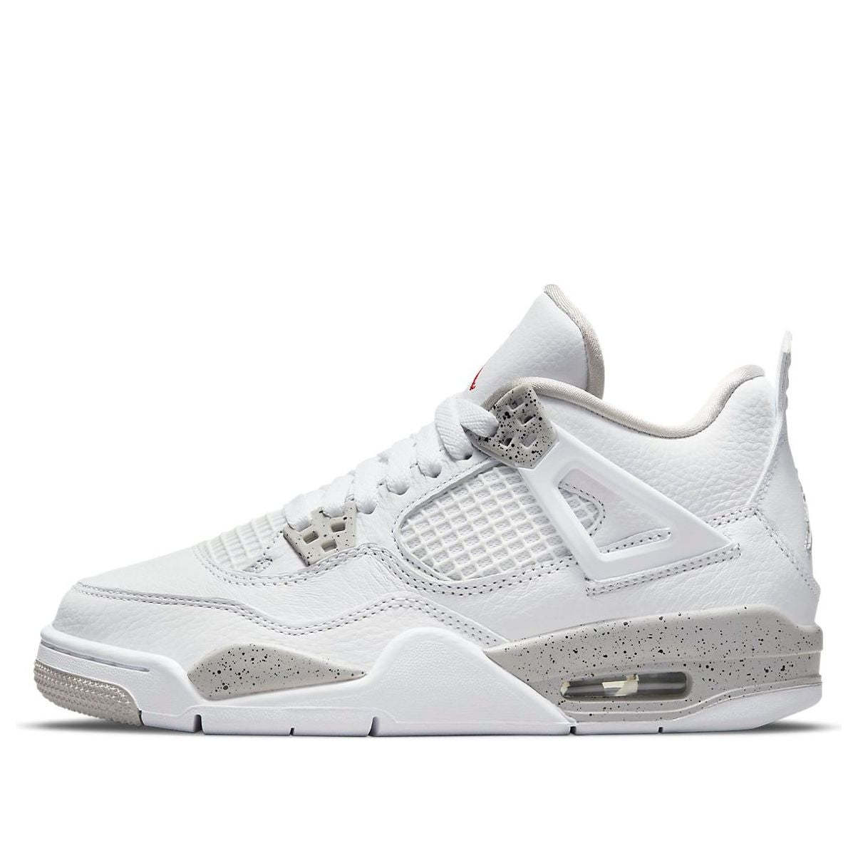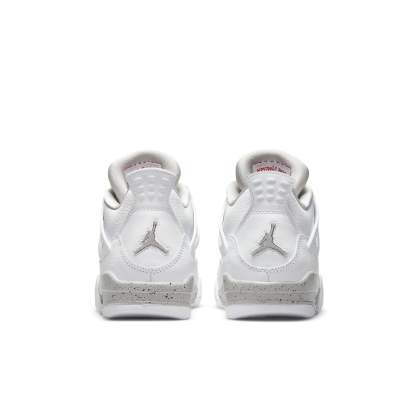 The Air Jordan 4 Retro GS ‘White Oreo’ is an updated colorway of the classic silhouette that MJ wore when he famously sank ‘the shot’ in the first round of the 1989 NBA Playoffs. This sneaker is perfect for big kids, and is constructed from white tumbled leather with grey Jumpman branding on the heel. The same grey finish is applied to the sneaker’s molded eyelets and foam midsole, with both components covered in black speckled detailing. Atop the white leather tongue, an embroidered Jumpman icon in Fire Red delivers a contrasting pop of color.