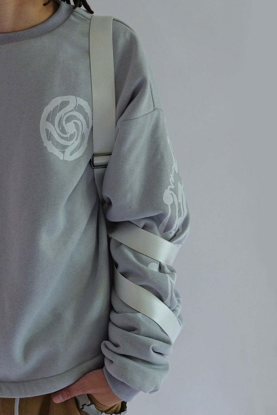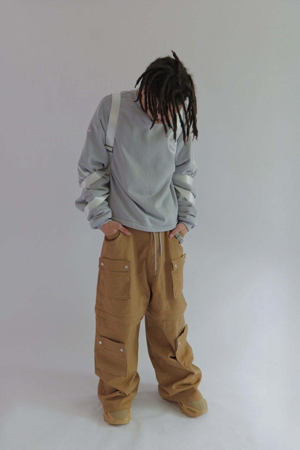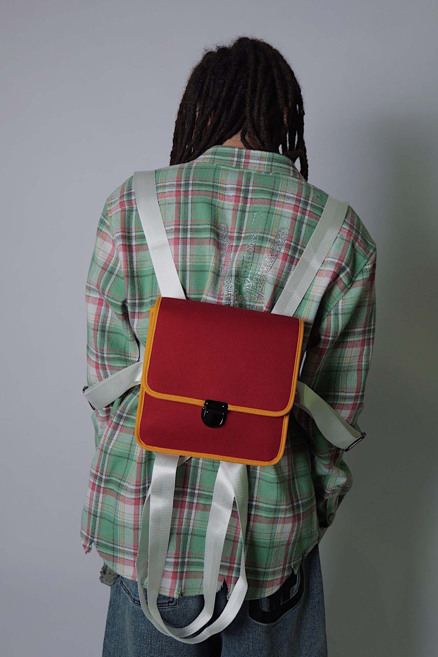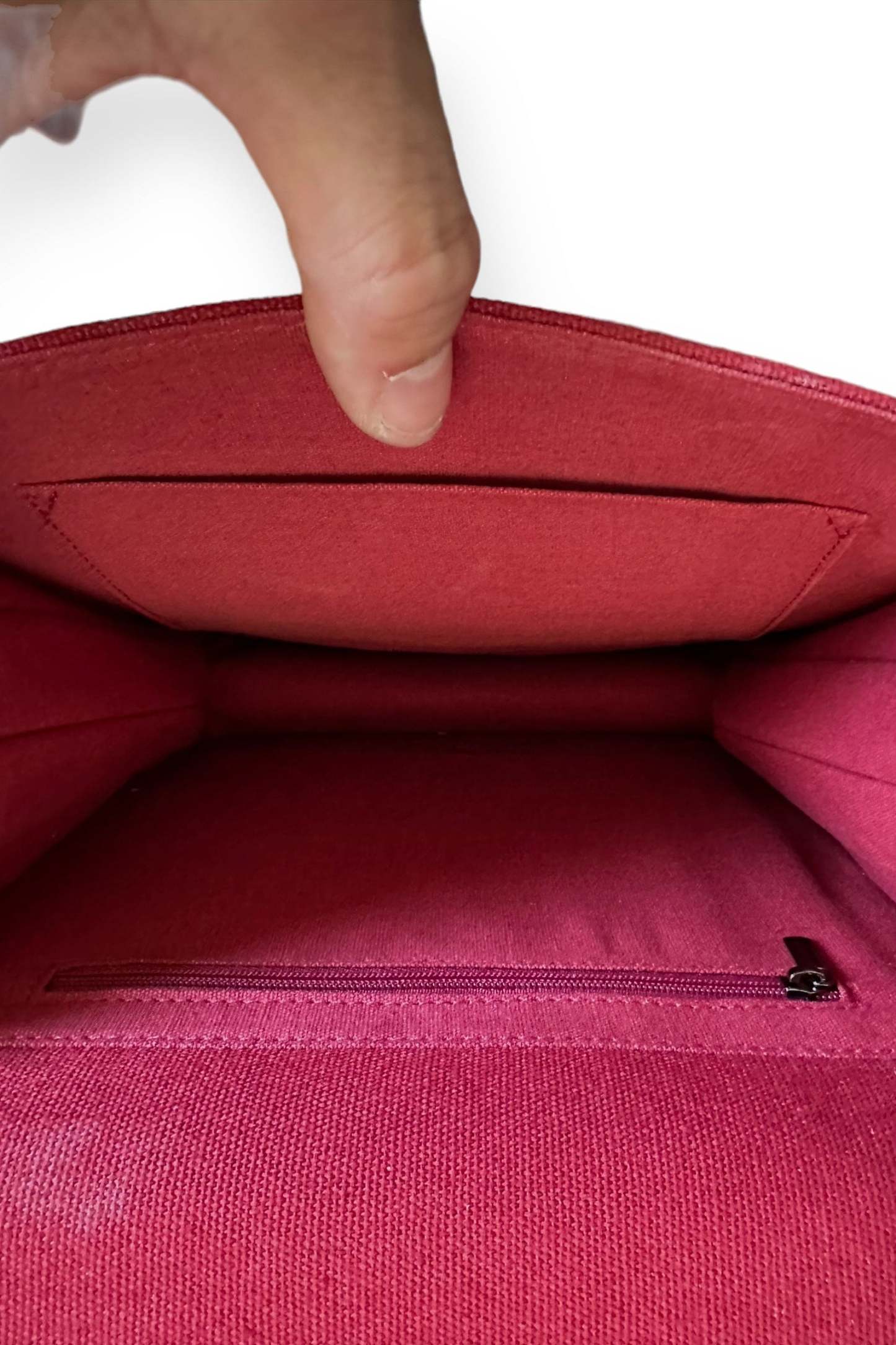 One size 100% canvasMetal buckle6 straps All straps adjustable 9in width and length 4in depth 2 inside pockets 1 zipper inside pocket
