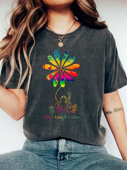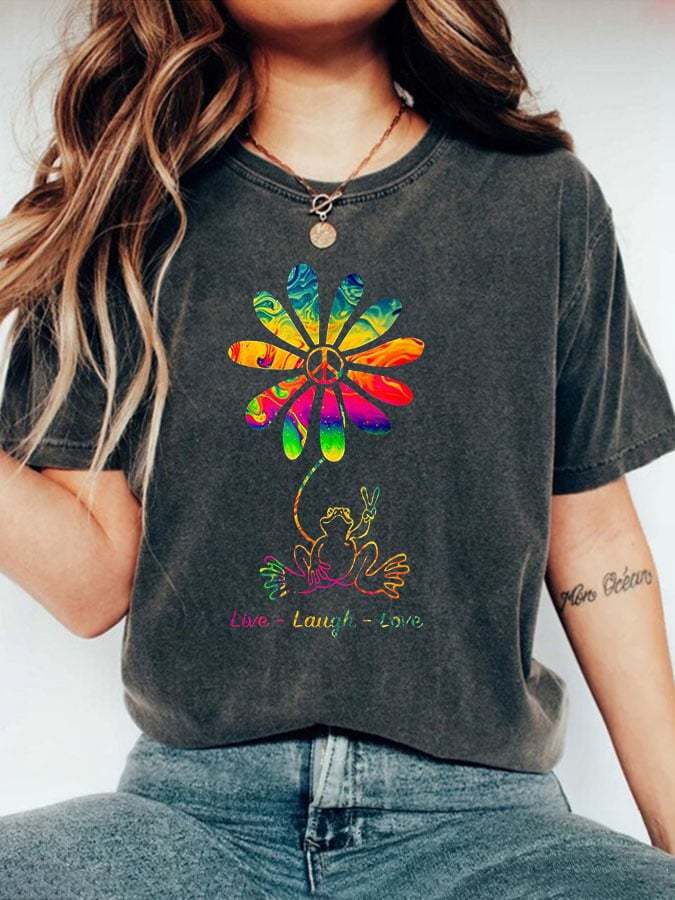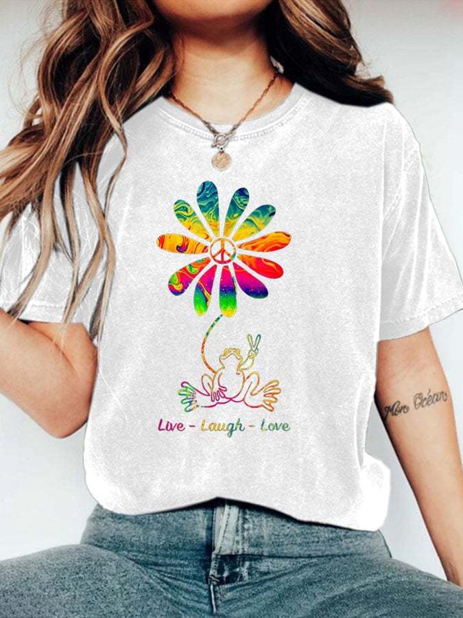 Women's Peace Love Frog Hippie Flower Daisy Crew Neck T-Shirt